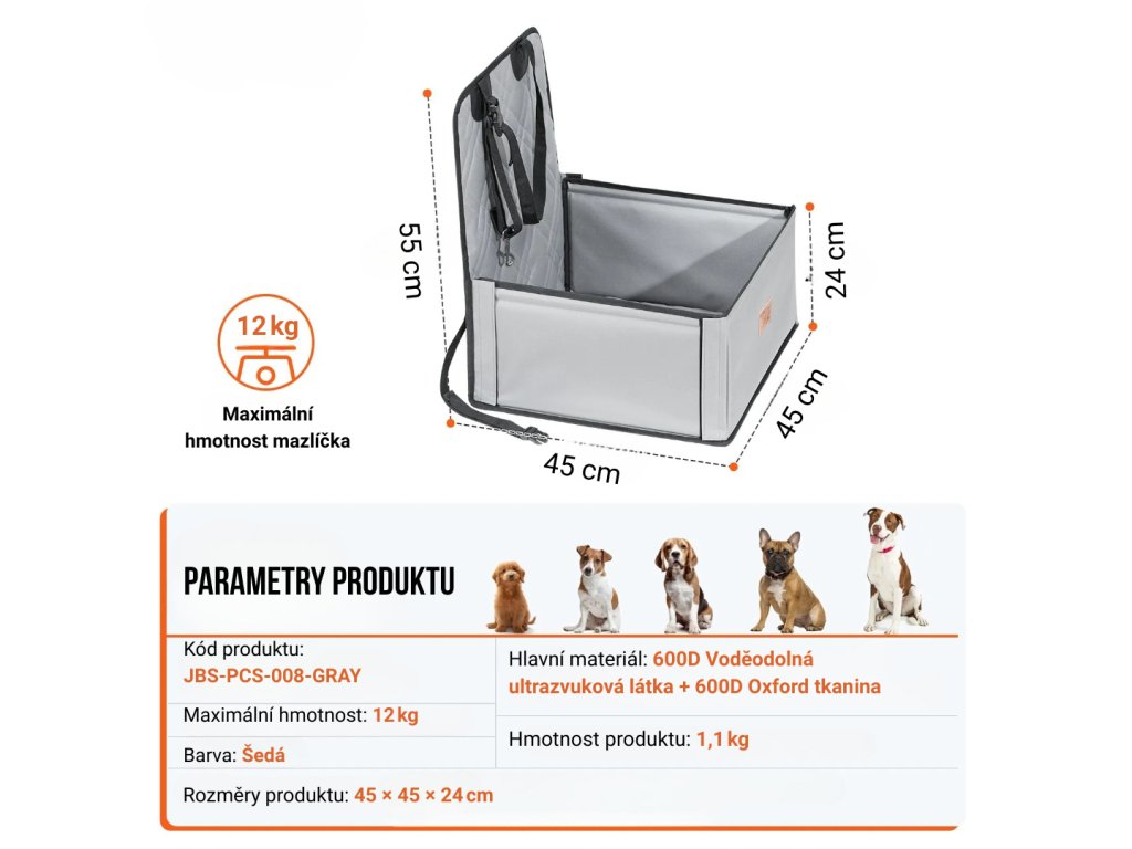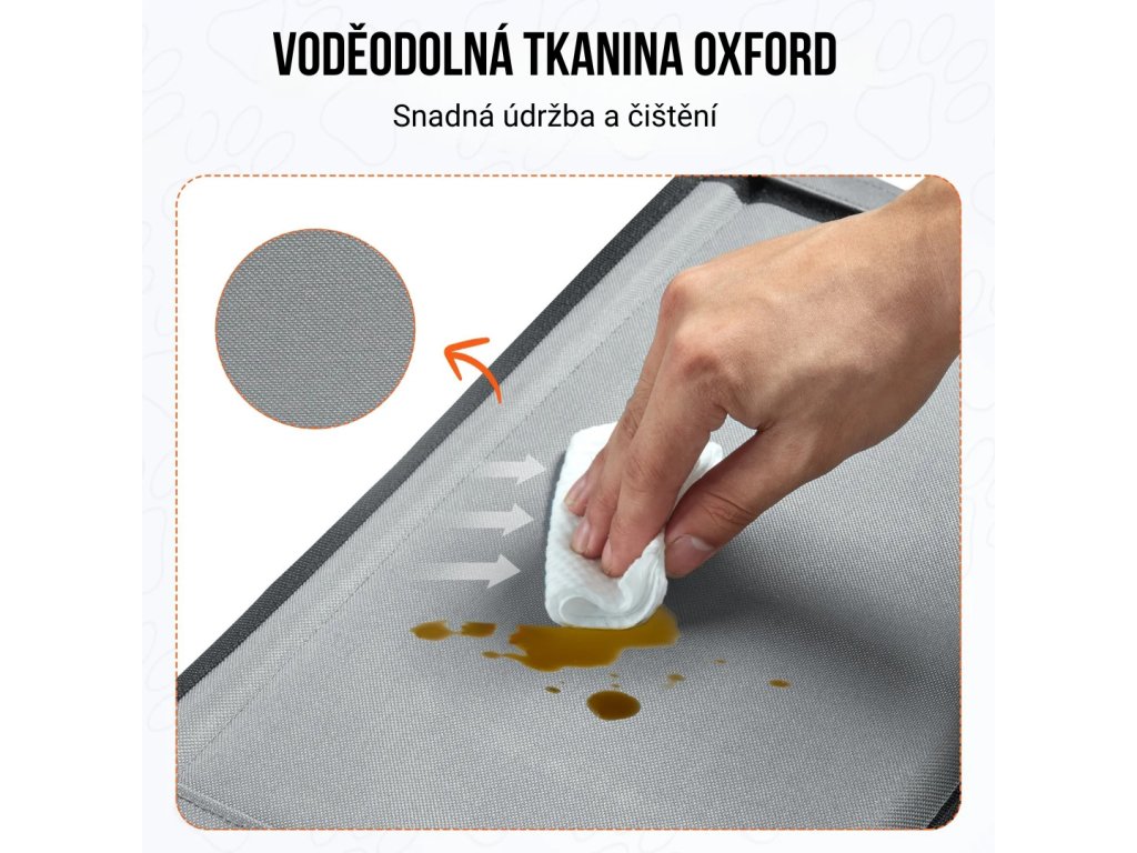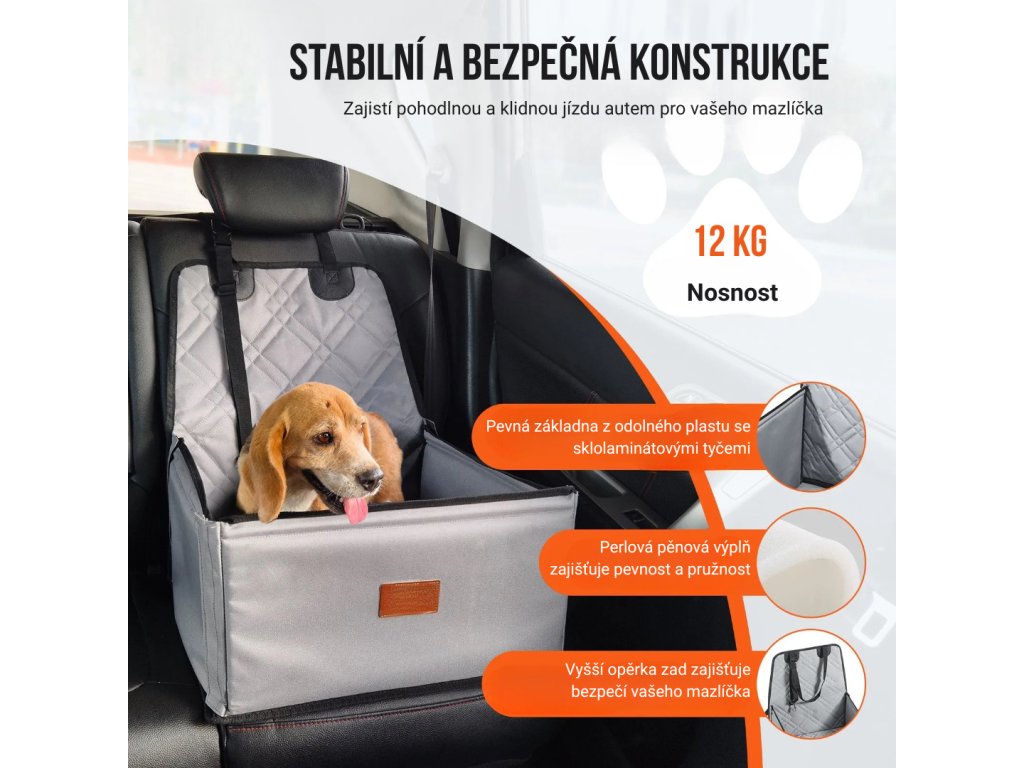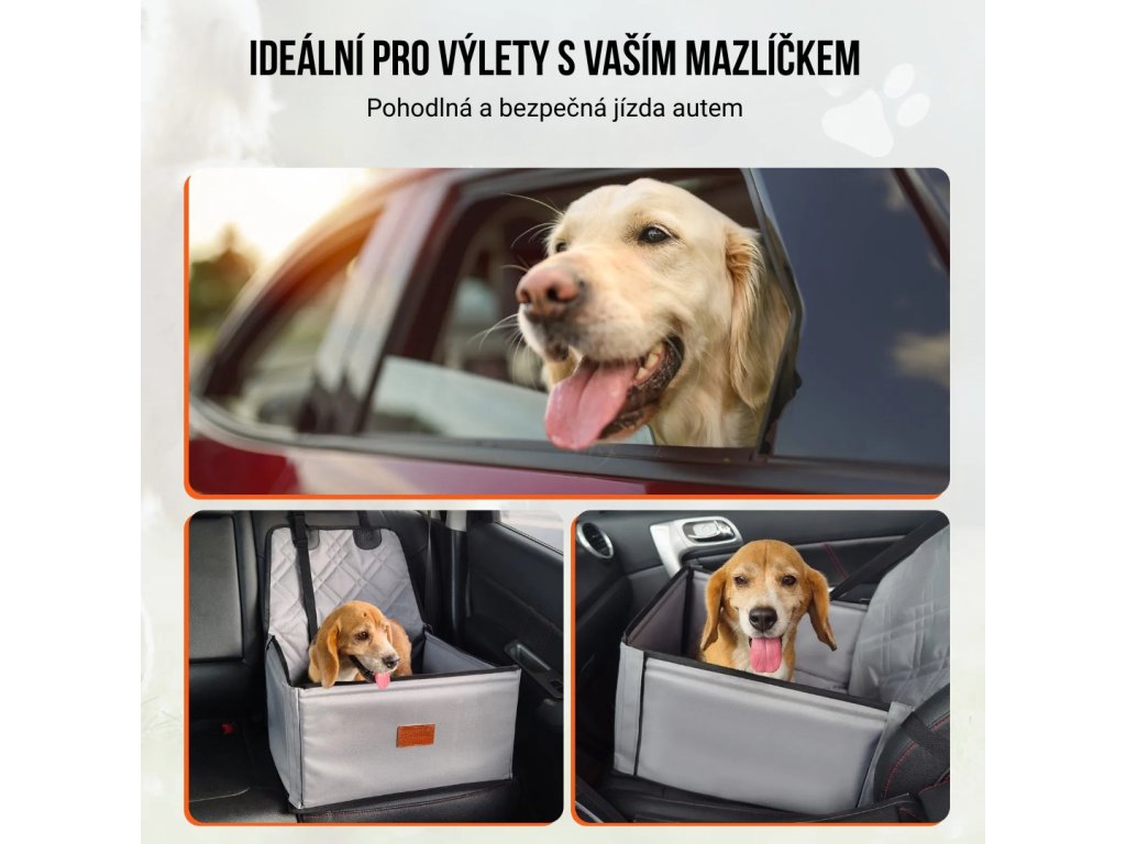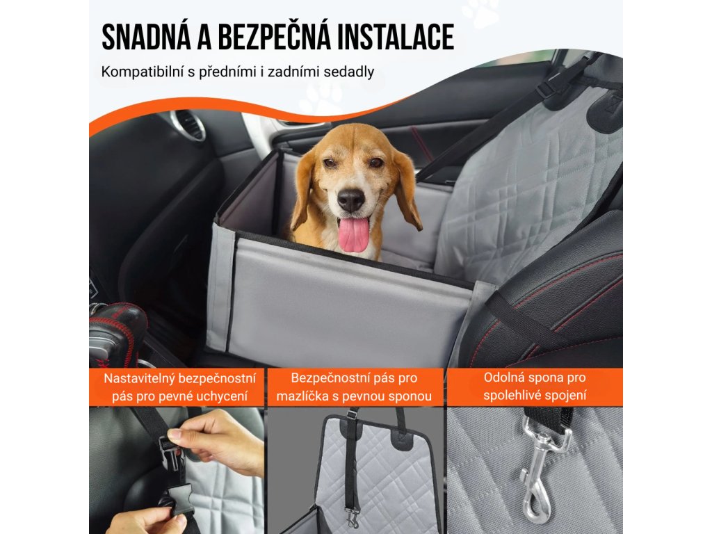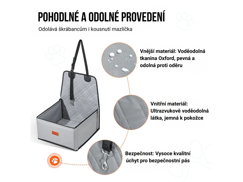 Sedačka má voděodolný Oxford materiál, měkký vnitřní potah a vysokou opěrku zad pro bezpečí mazlíčka. Instalace je snadná na přední i zadní sedadla a bezpečnost zajišťují nastavitelný pás a pevné spony. Odnímatelný potah umožňuje jednoduché čištění, ideální pro malé psy a pohodlné cestování autem i doma.