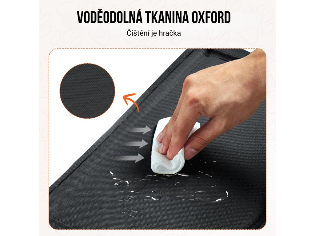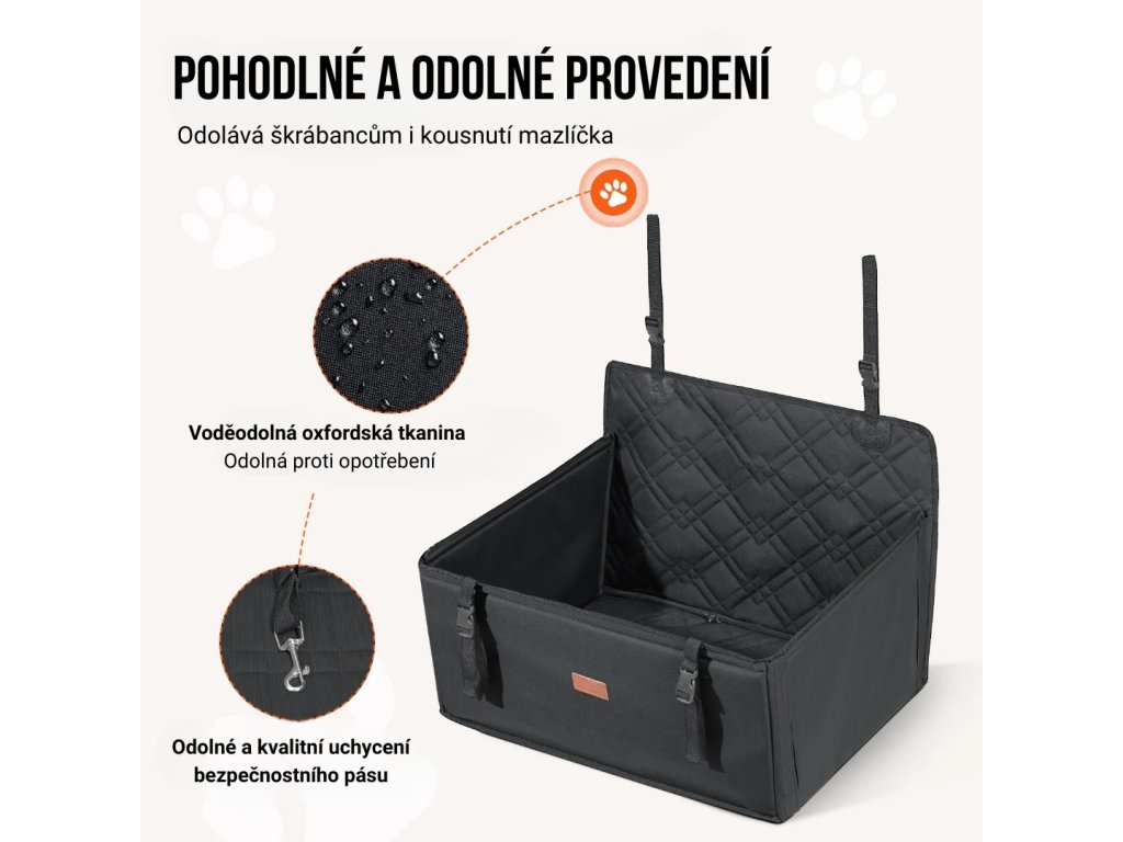 Povrch sedačky je vyroben z voděodolné Oxford tkaniny, která je odolná vůči oděru, vlhkosti i nečistotám. Materiál je vhodný pro každodenní provoz i delší cesty. Bezpečnostní popruhy z pevného nylonu zajišťují vysokou nosnost a dlouhou životnost produktu i při pravidelném používání. Sedačka si zachovává své vlastnosti i při vyšším zatížení a častém nastupování psa.