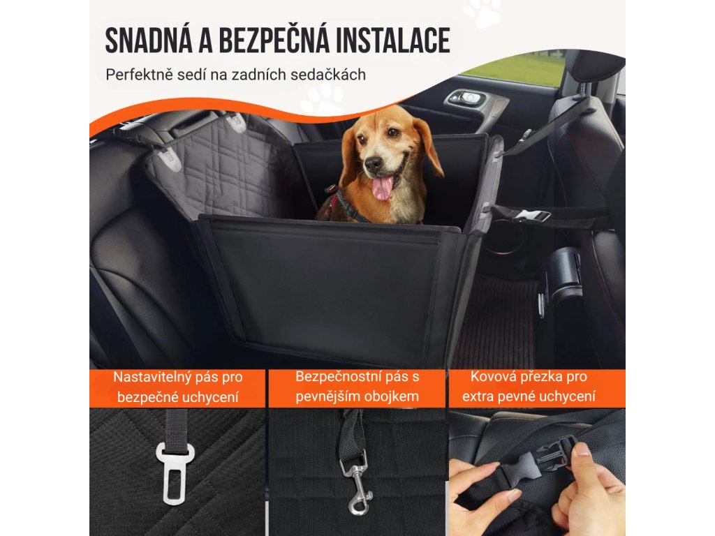 Autosedačka je určena k instalaci na zadní sedadlo vozidla a její montáž je jednoduchá a časově nenáročná. Nastavitelné bezpečnostní popruhy a kvalitní přezky umožňují pevné uchycení k sedadlům, čímž se zabrání posouvání sedačky během jízdy. Součástí je také integrovaný bezpečnostní pás pro připnutí psa, který zvyšuje jeho ochranu bez omezení pohodlí. Suché zipy umožňují přizpůsobení umístění podle typu vozidla.