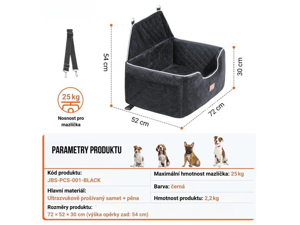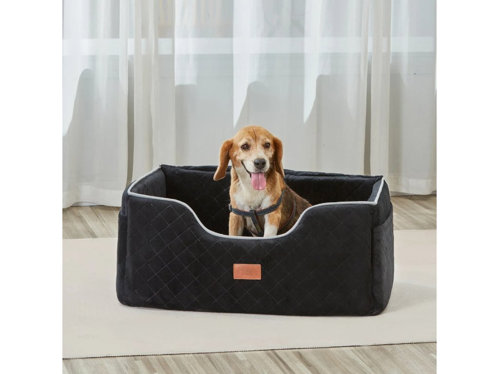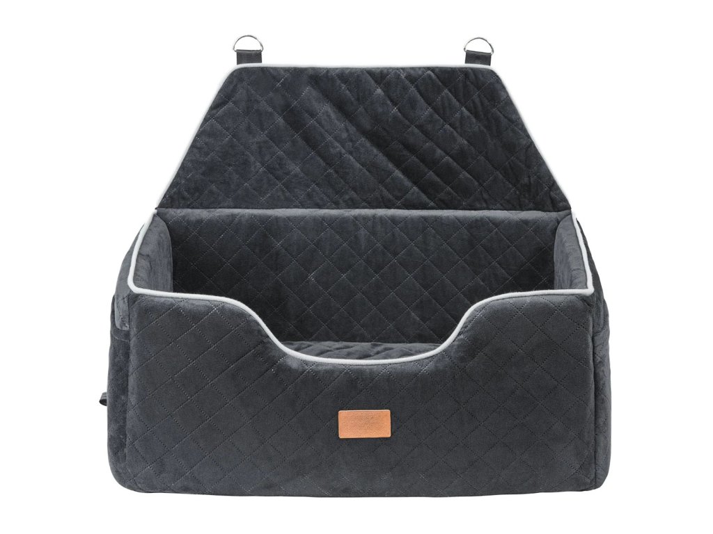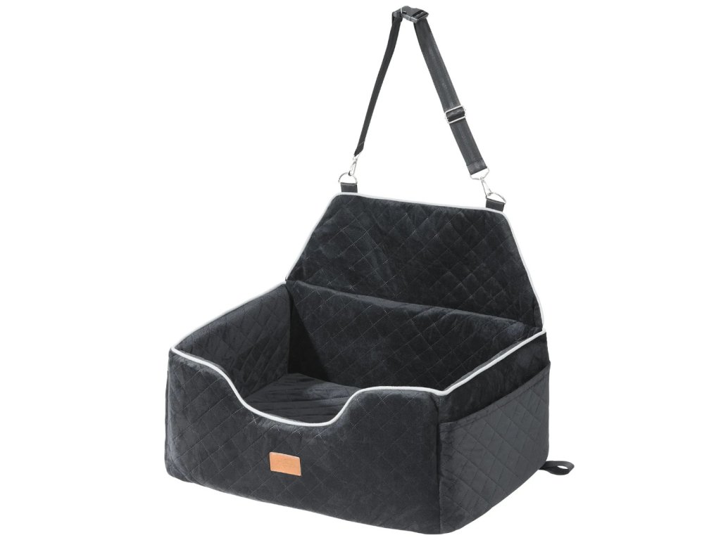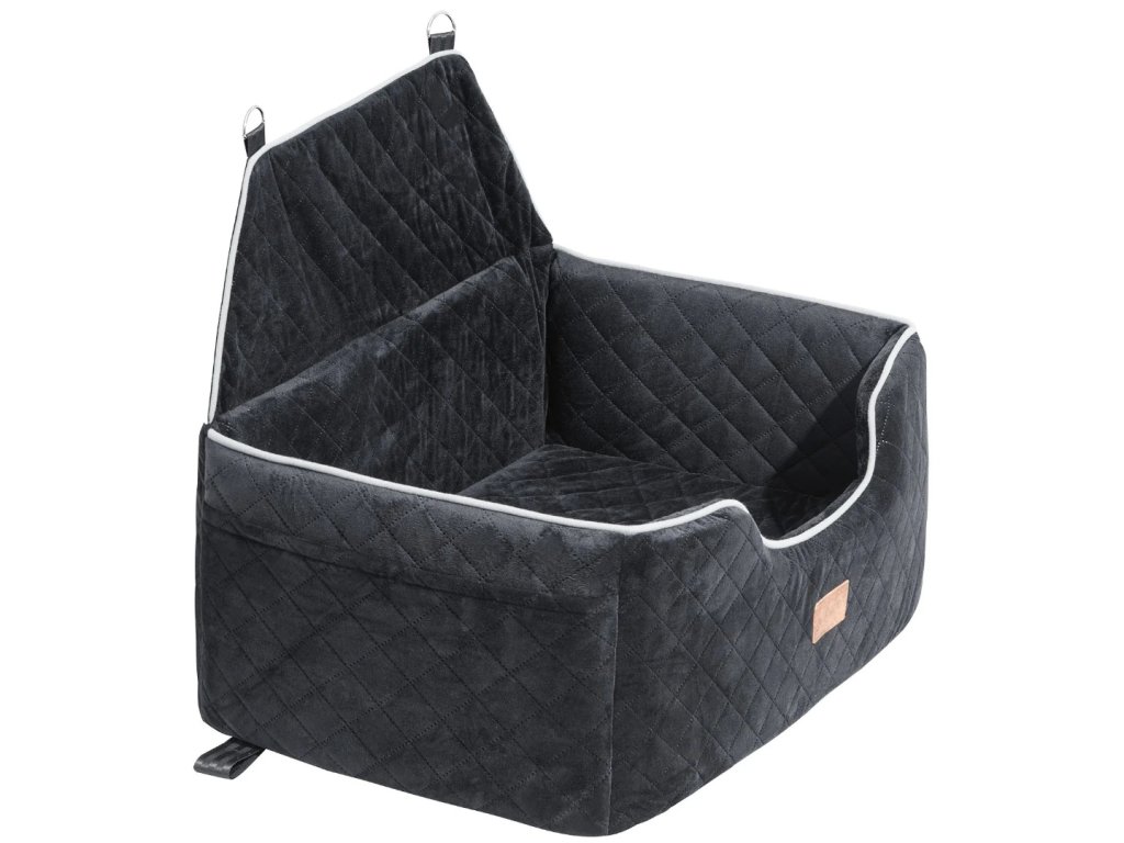 Autosedačka pro mazlíčky do 25 kg ve stylu pohovky, s odnímatelným polštářem z křišťálového sametu. Bezpečné uchycení díky nastavitelnému bezpečnostnímu pásu a pevným sponám, praktická boční kapsa a voděodolná vrstva pro snadné čištění.