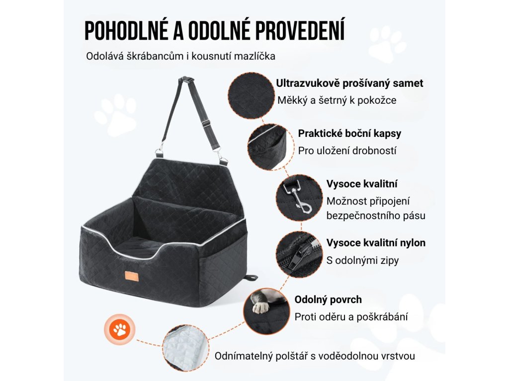 Sedadlo obsahuje prostornou boční kapsu, kam můžete uložit pamlsky, hračky nebo vodítko. Prodlužovaná opěrka zad zvyšuje bezpečnost při náhlém brzdění. Odnímatelný polštář s voděodolnou vrstvou chrání sedadlo před proniknutím tekutin a zjednodušuje údržbu. Povrch autosedačky je odolný proti oděru a poškrábání, takže vydrží i aktivnější mazlíčky.