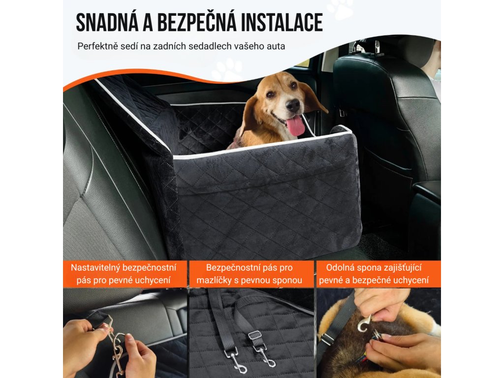 Autosedačku lze rychle a bezpečně upevnit na zadní sedadla auta. K dispozici je nastavitelný bezpečnostní pás a pevný pás pro mazlíčka, který zajišťuje, že sedadlo během jízdy nepodklouzává. Prémiové spony umožňují pevné a stabilní uchycení, takže se můžete soustředit na bezpečnou jízdu.