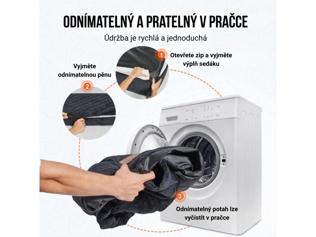 Celý látkový potah je odnímatelný a pratelný v pračce, výplň lze jednoduše vyjmout díky integrovanému zipu. Tento praktický systém umožňuje rychlé čištění a bezproblémovou údržbu. Sedačka je vhodná pro mazlíčky až do hmotnosti 25 kg a lze ji využít nejen v autě, ale i doma nebo při venkovních výletech. Po vybalení z vakuového balení doporučujeme nechat sedadlo cca 12 hodin, aby se plně obnovila jeho původní forma.