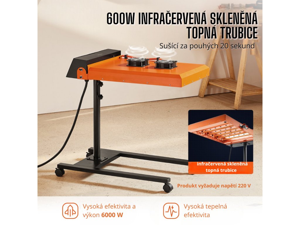 Díky vestavěnému topnému prvku o výkonu 6000 W dosahuje sušička ohřevu na požadovanou teplotu během pouhých 20 sekund. Inovativní infračervené skleněné trubice zajišťují vysokou tepelnou účinnost, což minimalizuje čekání a umožňuje rychlé a rovnoměrné sušení vašich tisků. Výkonné chlazení dvojitými ventilátory zabraňuje přehřívání a udržuje stabilní výkon při dlouhodobém provozu.