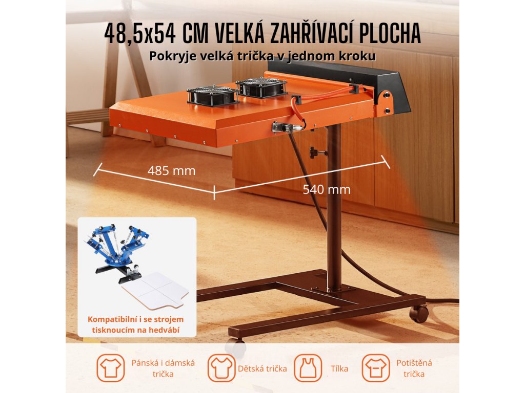 Sušička nabízí velkou sušící plochu o rozměrech 485 x 540 mm (19 x 21 palců), která je ideální pro sušení velkých tisků na tričkách a jiných textiliích. Tato plocha umožňuje rychlé zpracování i větších zakázek, což je ideální i pro profesionální tiskárny, kde je čas klíčovým faktorem.