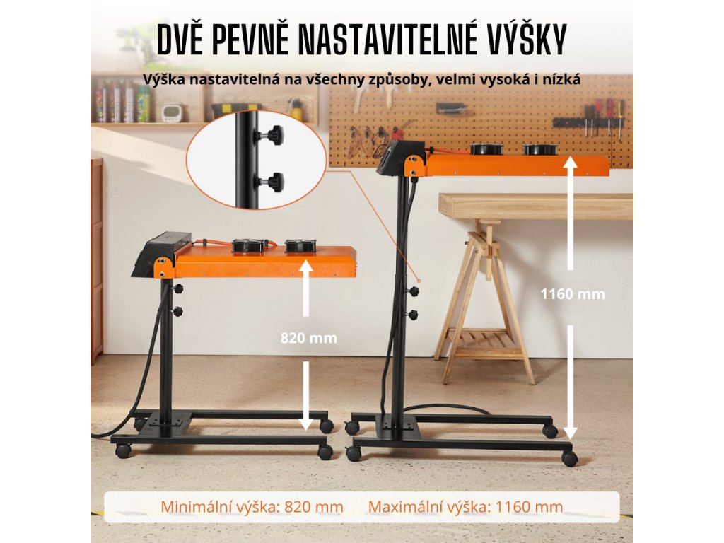 Sušička umožňuje snadné nastavení výšky od 82 do 116 cm, což zajišťuje pohodlné používání pro uživatele různé výšky i různé druhy projektů. Nastavitelná výška rovněž poskytuje možnost přizpůsobit zařízení různým typům textilií a tloušťce materiálu, což maximalizuje univerzálnost sušičky.