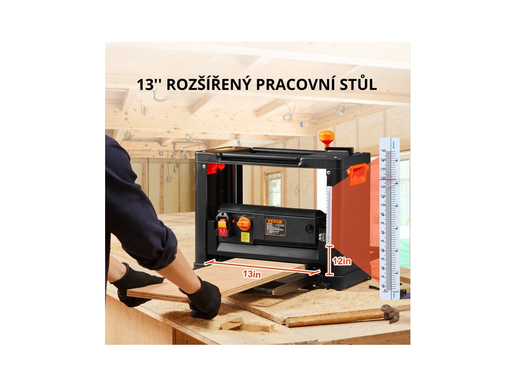 Výkonná srovnávací a tloušťkovací frézka s motorem 2000 W a otáčkami 23 500 ot/min umožňuje přesné hoblování desek až do šířky 33 cm a tloušťky 15 cm. Třínožová hoblovací hlava s vysokou tvrdostí (HRC 55–60) zaručuje hladký řez, přičemž dvě nastavitelné rychlosti posuvu (15 a 24 m/min) poskytují maximální kontrolu nad opracováním materiálu. Pro čisté pracovní prostředí je frézka vybavena systémem odsávání pilin s možností připojení průmyslového vysavače.