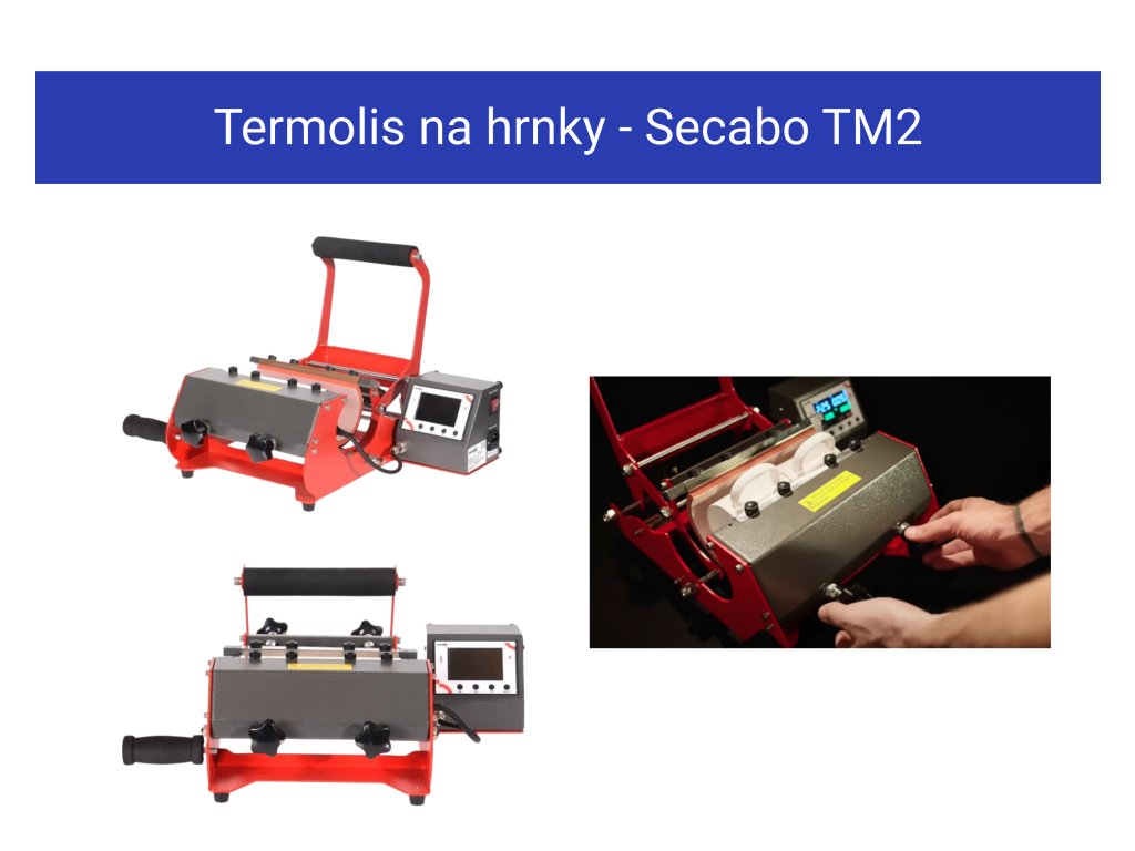 - Termolis Secabo TM2 – profesionální německý lis na hrnky s extra širokým topným tělesem, který umožňuje tisknout 2 hrnky současně nebo 1 velký hrnek/půllitr do výšky 21 cm. Digitální ovladač přesně řídí teplotu a čas, pracovní tlak je snadno nastavitený a zařízení umožňuje výměnu topných vložek pro dlouhodobou životnost a efektivní výrobu.