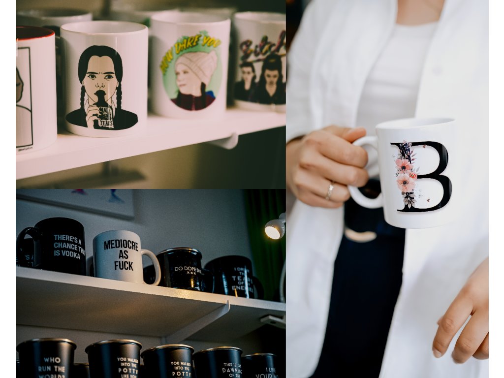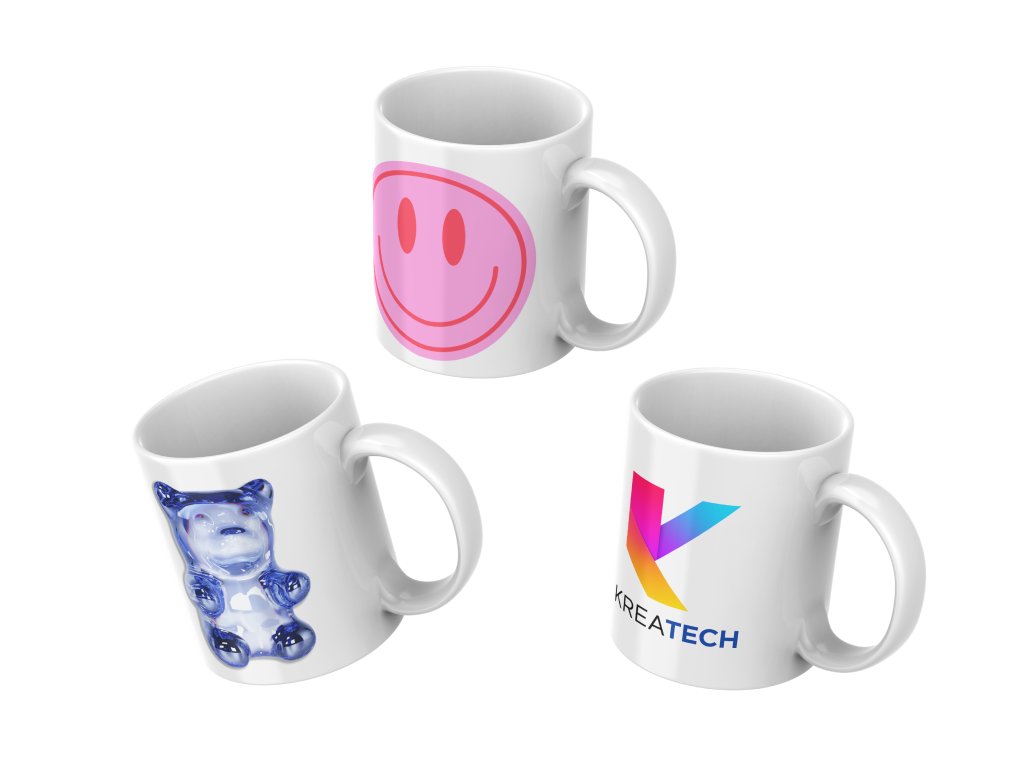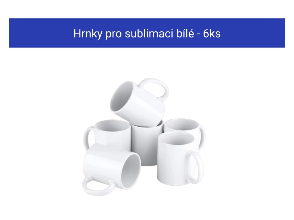 - Bílé hrnky třídy A+ (330 ml) – 6 kusů s vysokou bělostí a leskem, odolné vůči myčce, s rovnou plochou pro přesný potisk. Potisknutelná plocha: 20 × 9 cm.