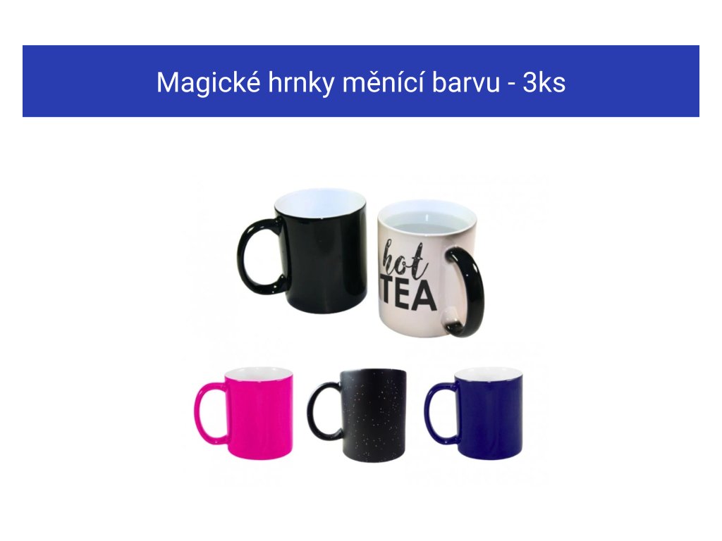 - Magické hrnky (300 ml) – 3 kusy (černý, růžový, modrý) s termoaktivní vrstvou, která odhalí grafiku po naplnění horkým nápojem. Potisknutelná plocha: 20 × 9 cm.