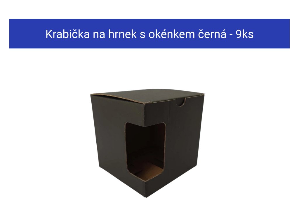 - Černé krabičky s okénkem – 12 kusů pro bezpečné skladování, prezentaci či prodej potištěných hrnků.