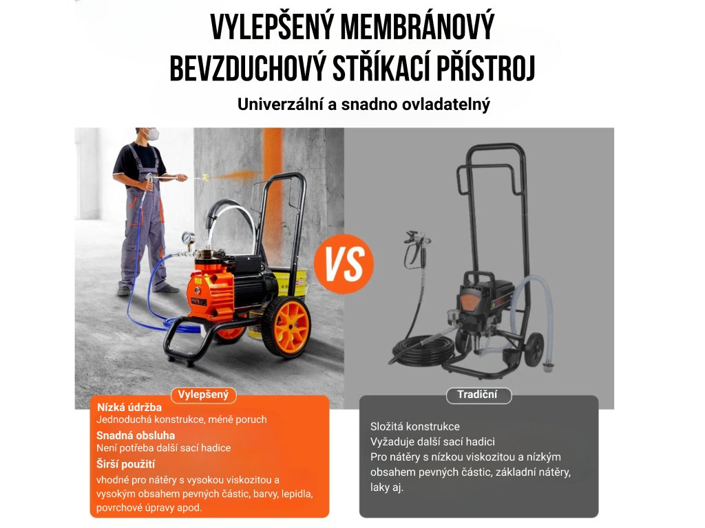 Airless stříkací zařízení s membránovým čerpadlem na vozíku je navrženo pro práci s nátěrovými hmotami s vyšší viskozitou a obsahem pevných částic. Díky tomu je vhodné nejen pro klasické barvy, ale i pro lepidla a další typy povrchových úprav. Samosací systém umožňuje snadné uvedení do provozu bez nutnosti přídavných sacích trubic. Konstrukce je uzpůsobena pro jednoduchou obsluhu a nízké nároky na údržbu.