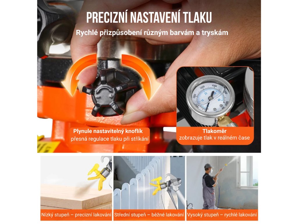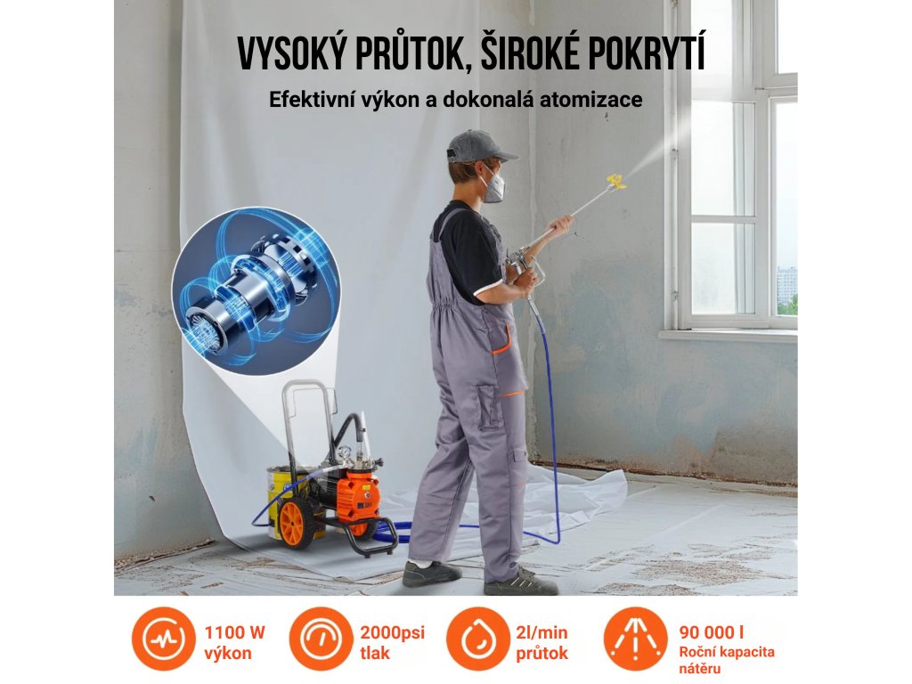 Zařízení je vybaveno motorem o výkonu 1100 W, který vyvine pracovní tlak až 2000 PSI. Při maximálním průtoku 2,0 l/min dokáže spolehlivě zajistit nepřetržitý a rovnoměrný nátěr i na rozsáhlejších plochách. Ve srovnání s tradičními metodami je práce s tímto zařízením až 5× rychlejší než válečkem a 12× rychlejší než štětcem, což zvyšuje efektivitu u středně velkých i velkých projektů.