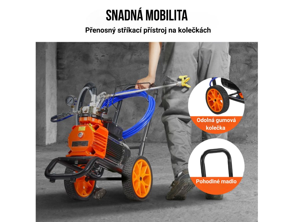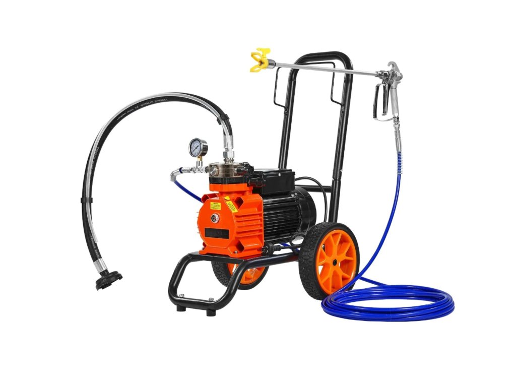 Stříkací zařízení Airless, 1100 W, 2000 PSI, průtok 2,0 l/min, na vozíku (membránové), pistole + 9 m hadice a prodlužovací tyč