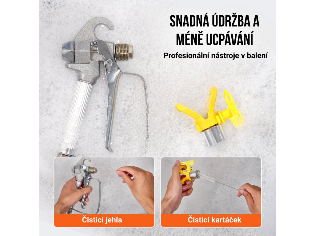 Součástí balení je stříkací pistole, 9 m vysokotlaká hadice a prodlužovací tyč, které rozšiřují dosah a umožňují aplikaci nátěrů i na hůře dostupná místa nebo ve výškách. Dále jsou přibaleny čisticí jehly a kartáče, které usnadňují údržbu trysek a vedení a prodlužují životnost zařízení.