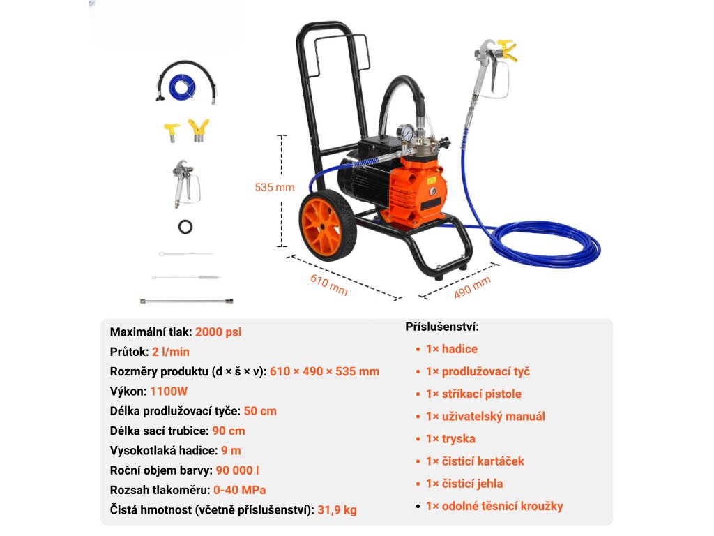 Airless stříkací zařízení s výkonným 1100W motorem, tlakem až 2000 PSI a průtokem 2,0 l/min je určeno pro efektivní nanášení barev, lepidel a dalších nátěrových hmot. Díky vozíku s koly, 9m hadici, stříkací pistoli a prodlužovací tyči je vhodné pro střední i velké projekty, kde je vyžadováno rychlé a rovnoměrné pokrytí ploch. Součástí balení je i čisticí sada, která usnadňuje údržbu.