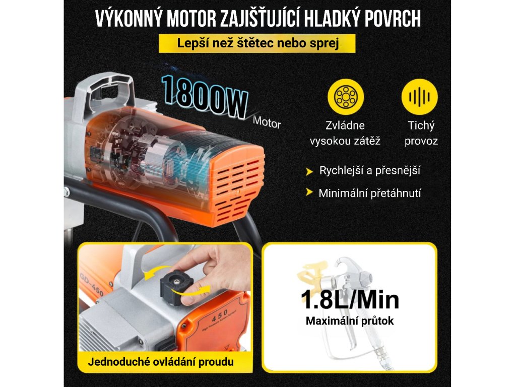 Zařízení je vybaveno bezuhlíkovým motorem o výkonu 1800 W, který pracuje tiše a spolehlivě. Poskytuje maximální průtok 1,8 l/min a tlak až 3000 psi ± 10 %. Pomocí regulátoru průtoku lze snadno přizpůsobit množství nanášeného materiálu konkrétnímu projektu.