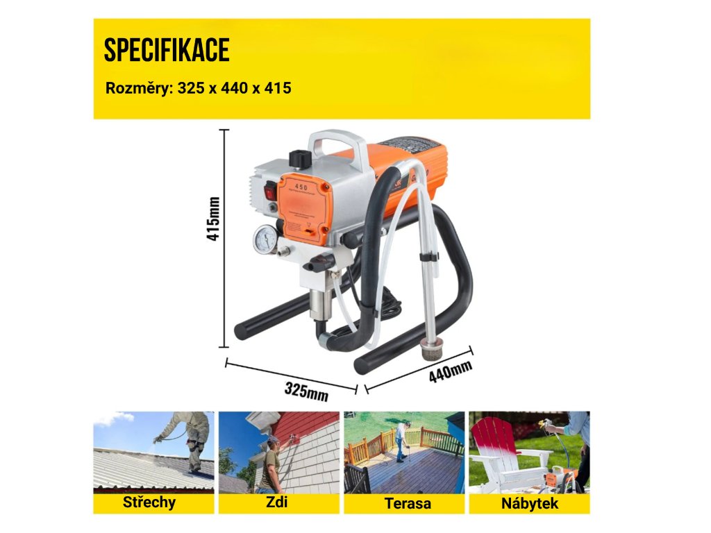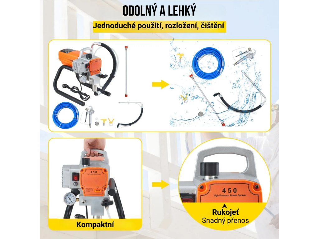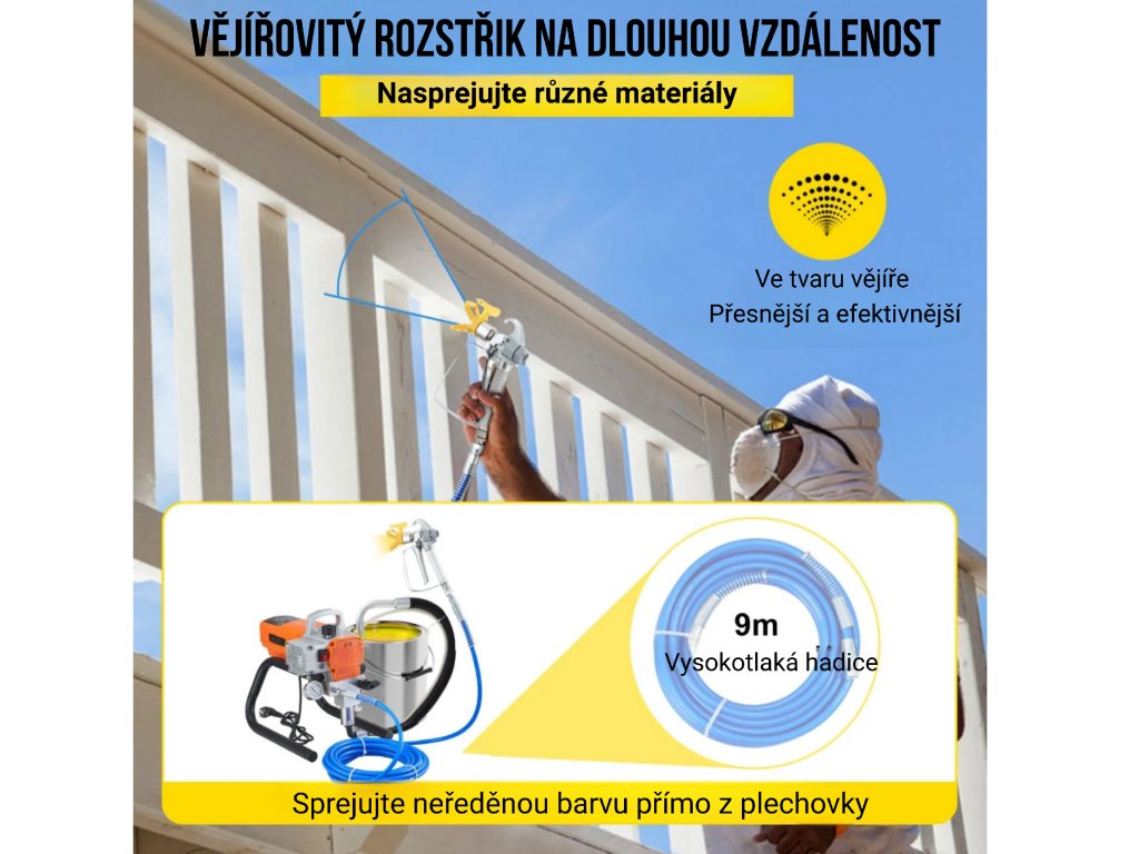 Součástí je odolná kovová stříkací pistole s vějířovým rozstřikem, která zajišťuje jemnou atomizaci barvy a rovnoměrný nános. Pro komfortní práci na rozsáhlejších plochách je k dispozici 9 m vysokotlaká hadice a 0,5 m prodlužovací trubka, díky čemuž není nutné zařízení často přemisťovat.