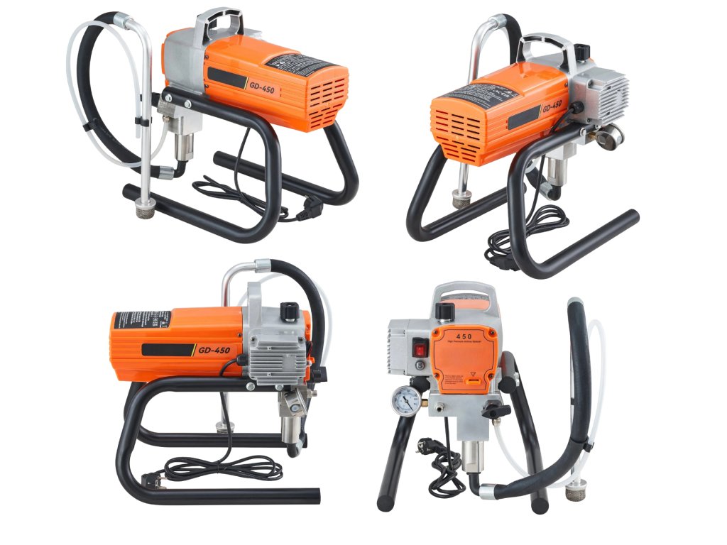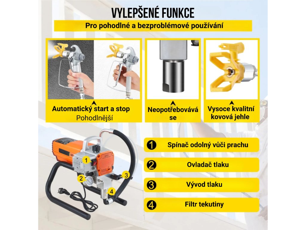 Stříkací zařízení nabízí automatické vypínání, prachotěsný spínač a otočný regulátor tlaku pro přesné nastavení. Stabilitu provozu zajišťuje přetlakový ventil a integrovaný filtr se postará o čistý a plynulý průtok barvy.