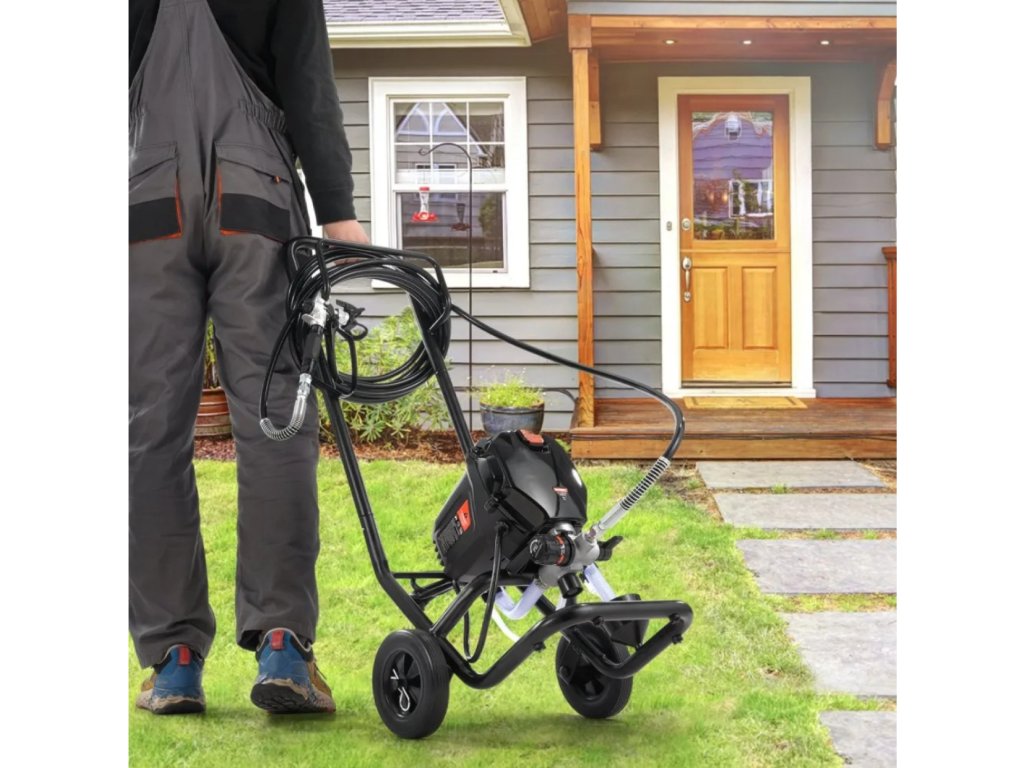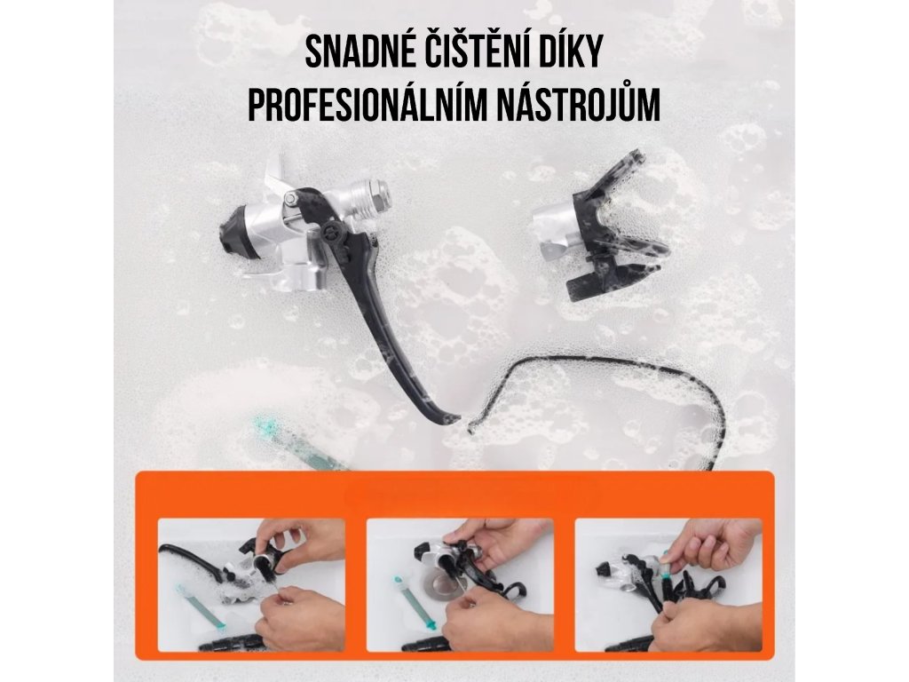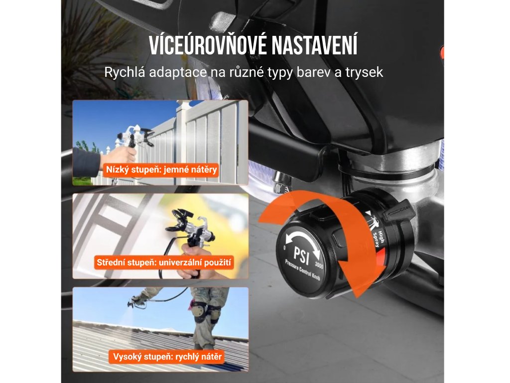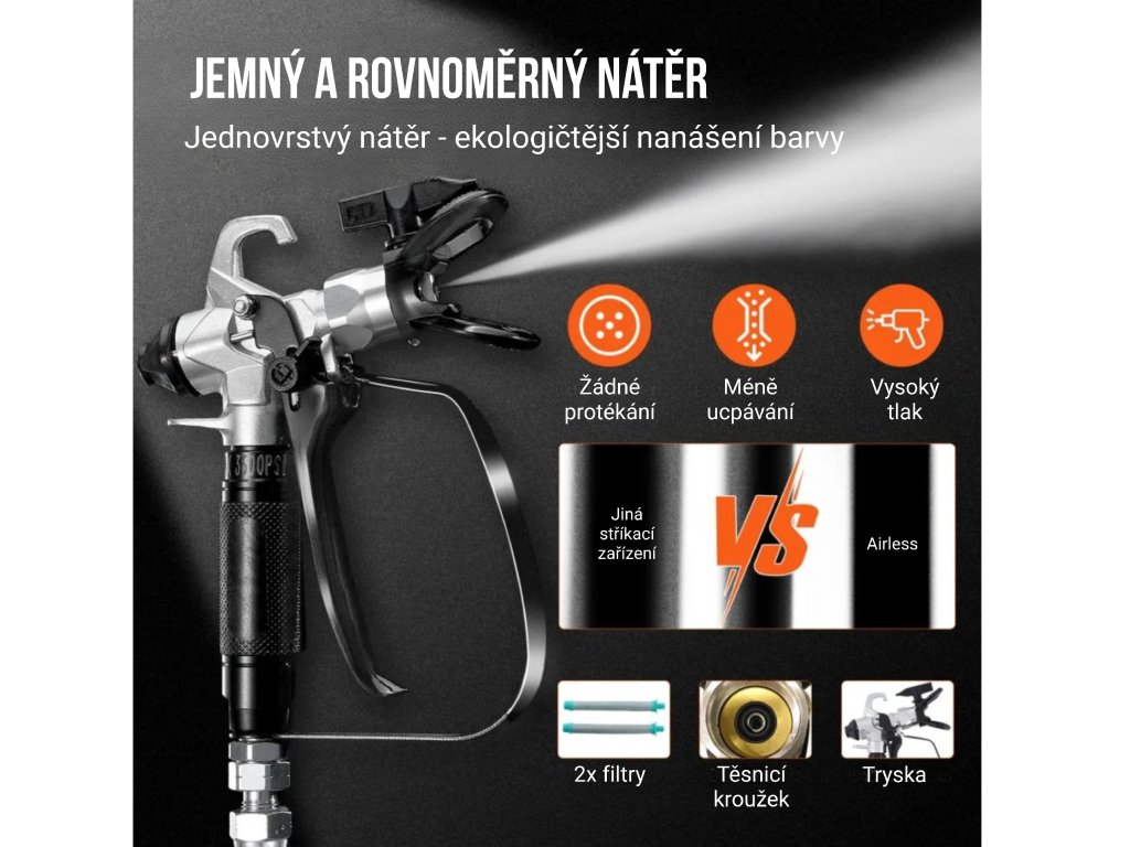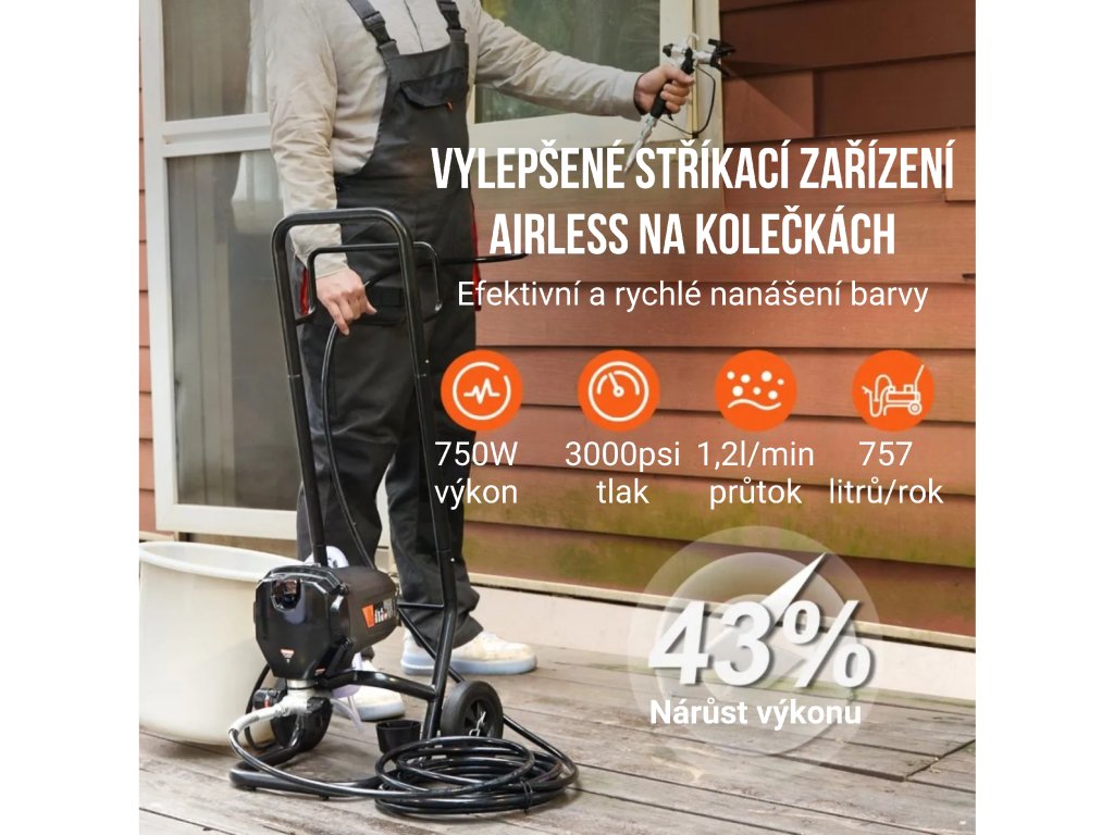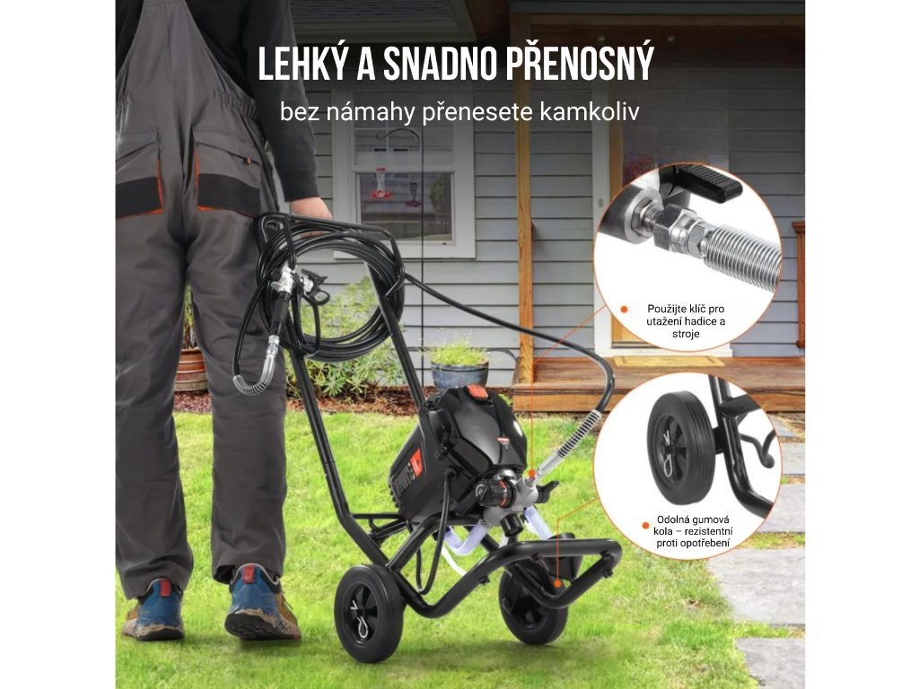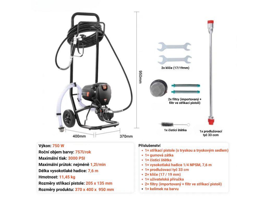 Airless stříkací zařízení s výkonem 750 W, tlakem 3000 PSI a průtokem 1,2 l/min umožňuje rychlé a rovnoměrné nanášení barev. Odolný kovový rám, gumová vysokotlaká hadice a odnímatelné čerpadlo zajišťují dlouhou životnost a snadnou údržbu. Vozík a prodlužovací trubka umožňují pohodlnou manipulaci i při práci ve výškách nebo na rozsáhlých plochách.