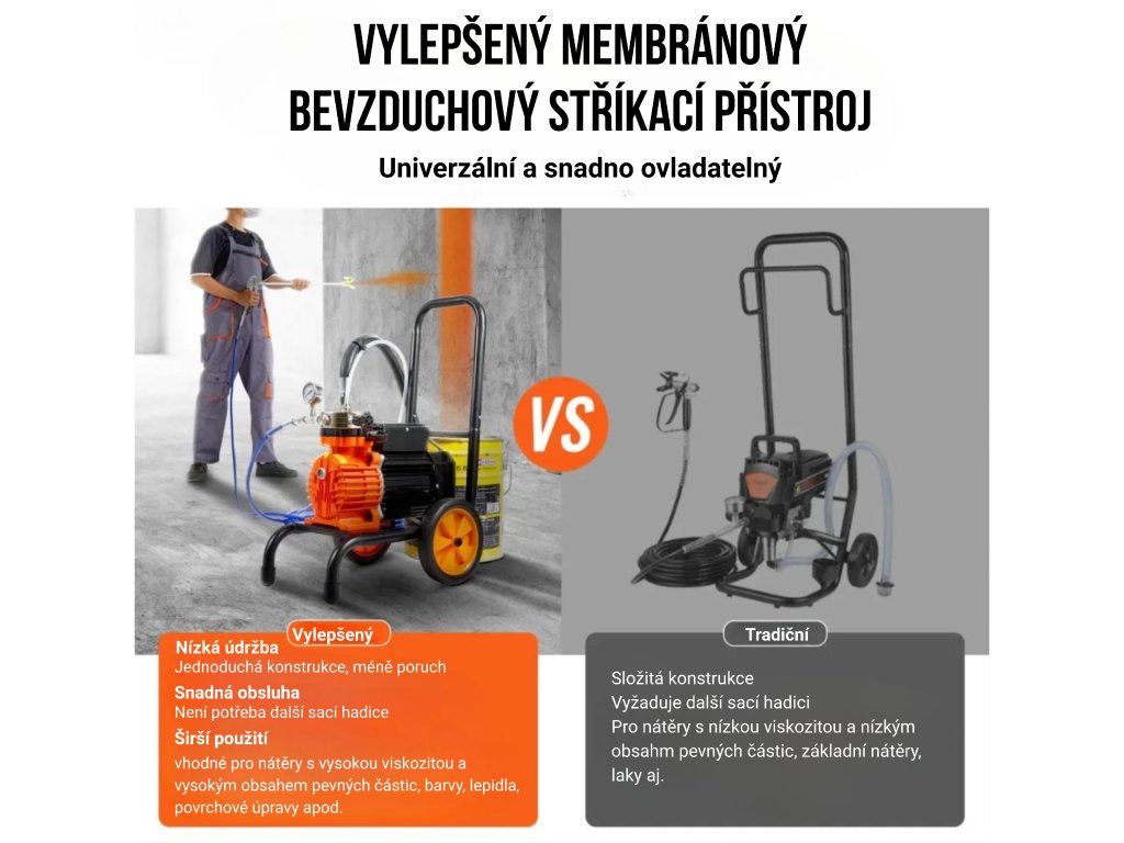 Membránové Airless zařízení zvládne nejen klasické barvy, ale i materiály s vyšší viskozitou či obsahem pevných částic – od nátěrových hmot až po lepidla. Samosací systém zajišťuje jednoduchou přípravu bez nutnosti přídavných sacích trubic a zároveň minimalizuje nároky na údržbu.