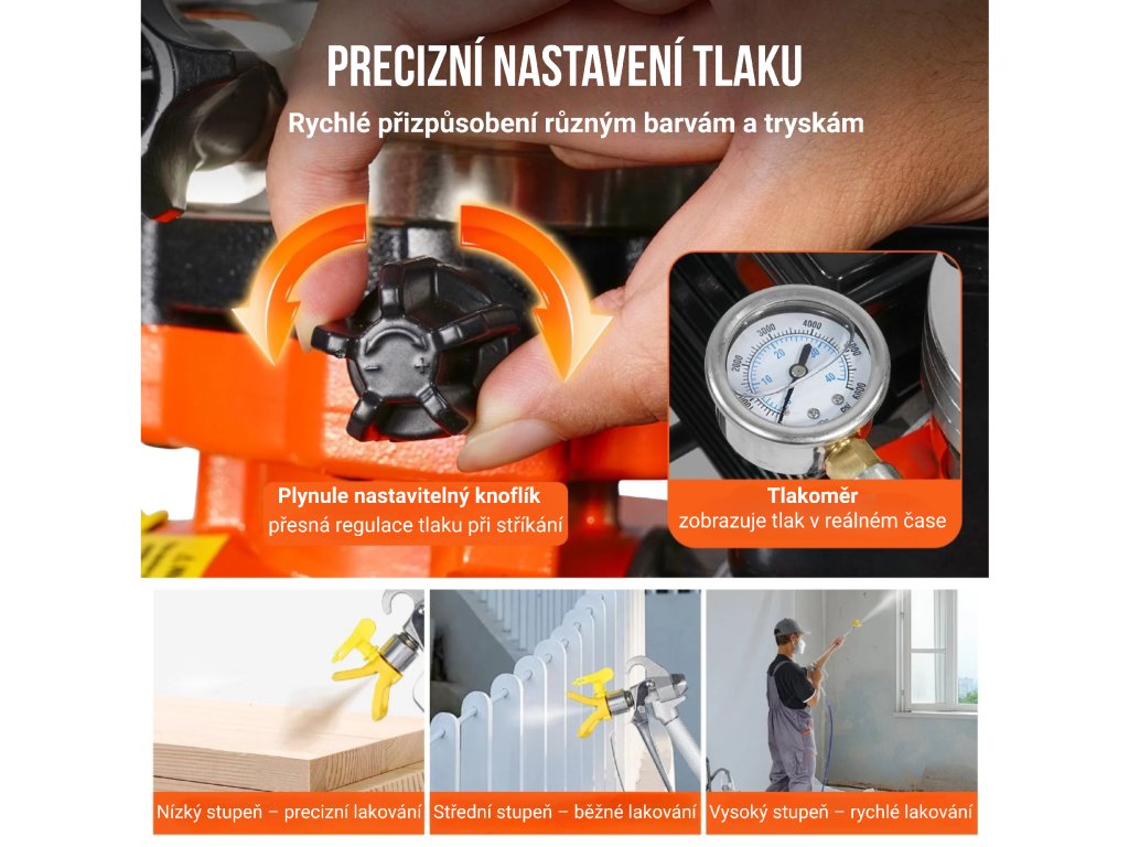 S motorem o výkonu 900 W a tlakem až 1800 PSI je zařízení konstruováno pro rovnoměrný a nepřerušovaný nátěr velkých ploch. Díky průtoku 1,8 l/min zvládne práci výrazně rychleji než tradiční metody – až 5× rychleji než váleček a 12× rychleji než štětec. Ideální volba pro střední i velké projekty v interiéru i exteriéru.