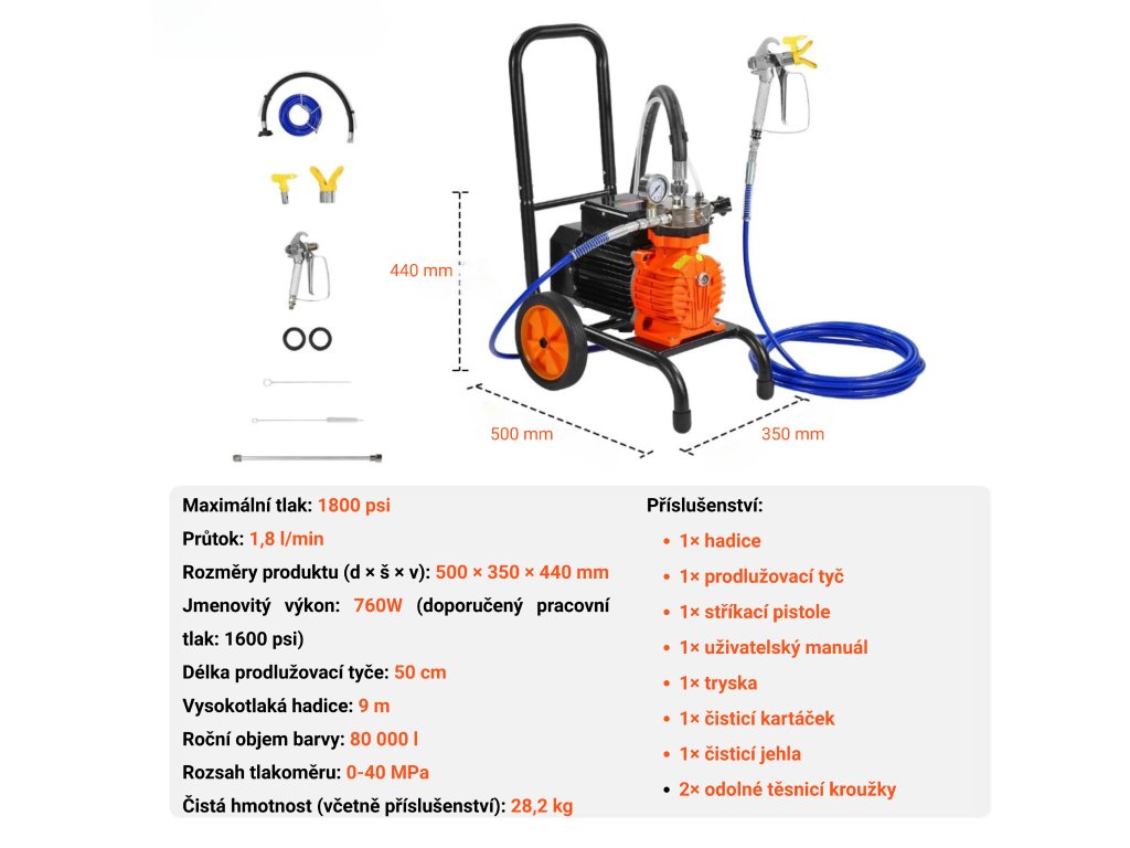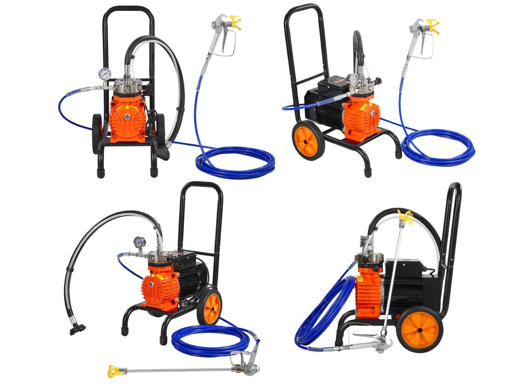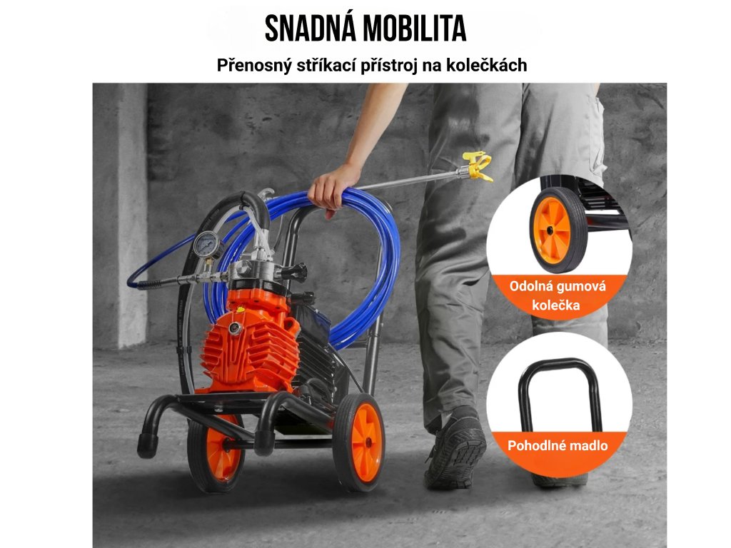 Stříkací zařízení Airless, 900 W, 1800 PSI, průtok 1,8 l/min, na vozíku (membránové), pistole + 9 m hadice a prodlužovací tyč