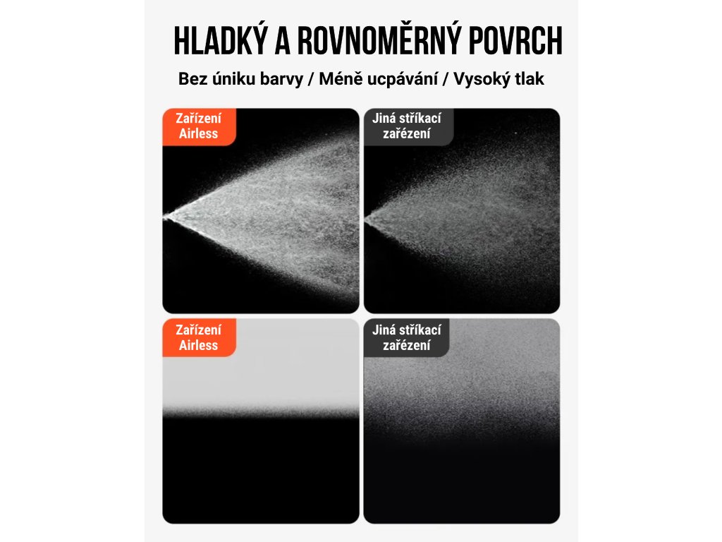 Airless stříkací zařízení je vybaveno výkonným 950 W motorem, který generuje tlak až 3000 PSI a umožňuje rychlé pokrytí velkých ploch. Maximální průtok 2,0 l/min zajišťuje rovnoměrné a hladké nanášení barev. Díky technologii Airless je zařízení až 5× rychlejší než váleček a 12× rychlejší než štětec, což ho činí vhodným pro střední a velké projekty, jako jsou fasády, ploty, terasy, garáže či nábytek.