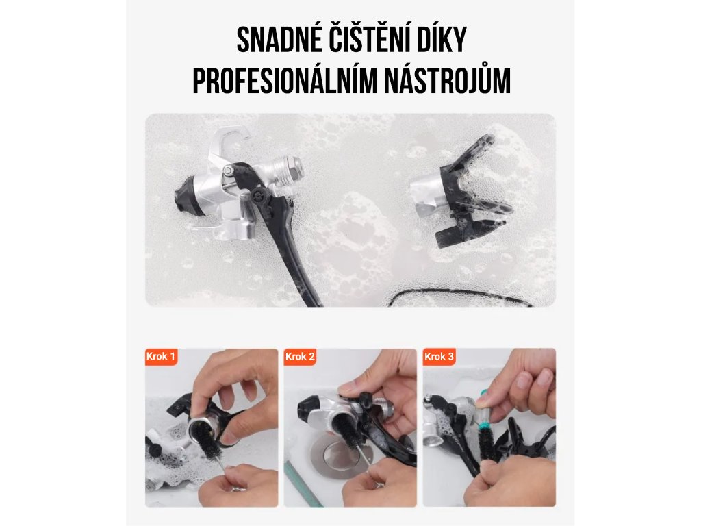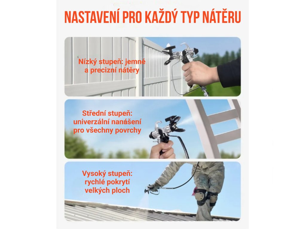 Díky profesionálnímu příslušenství a vějířovému rozstřiku je dosaženo rovnoměrného a jemného nanesení barvy bez úniků a ucpávání trysky. Zařízení umožňuje efektivní využití materiálu a zajišťuje, že každý nátěr je čistý a přesný, s minimálními ztrátami barvy.