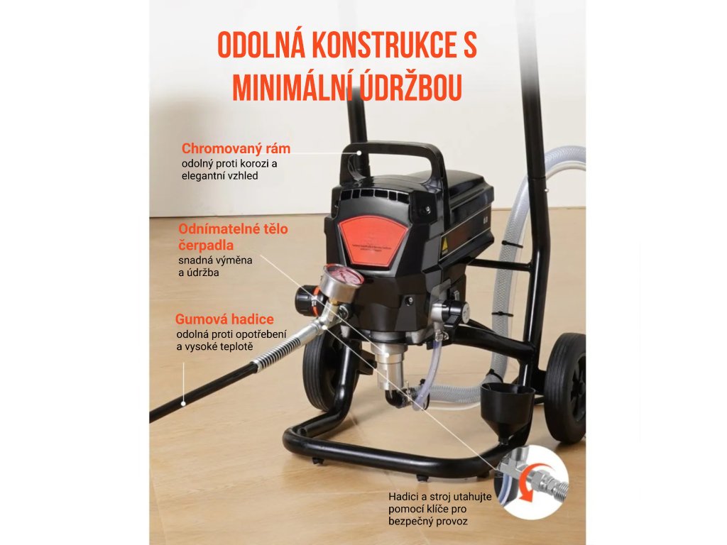 Stříkací zařízení je postaveno na pevný kovový rám, který je odolný proti opotřebení a vysokým teplotám. Profesionální gumová hadice zajišťuje odolnost proti opotřebení a dlouhou životnost. Odnímatelné tělo čerpadla a dodaná čisticí štětka umožňují rychlou a jednoduchou údržbu. Vozík se kolečky umožňuje pohodlné přesouvání zařízení, prodlužovací trubka zvyšuje dosah při práci ve výškách i na zemi a minimalizuje namáhání uživatele.