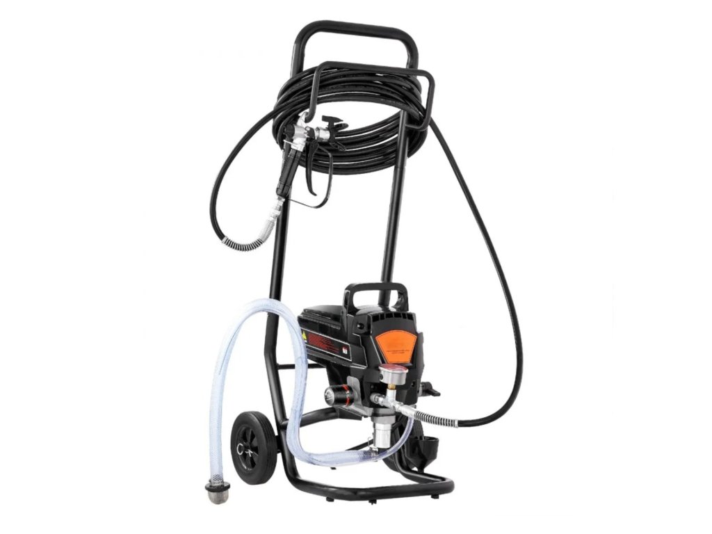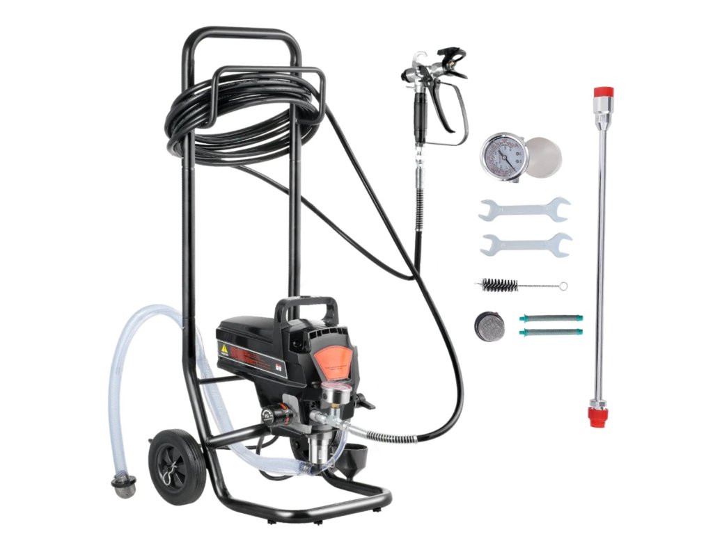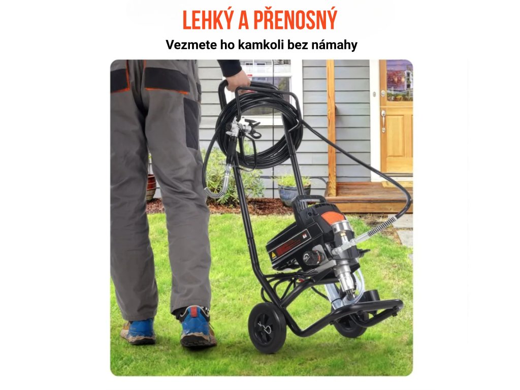 Airless stříkací zařízení s výkonem 950 W, tlakem 3000 PSI a průtokem 2,0 l/min umožňuje rychlé a rovnoměrné nanášení barev. Odolný kovový rám, gumová hadice a odnímatelné čerpadlo zajišťují dlouhou životnost a snadnou údržbu. Vozík a prodlužovací trubka umožňují pohodlnou manipulaci i při práci ve výškách nebo na rozsáhlých plochách.