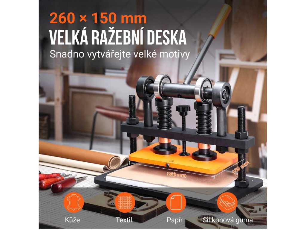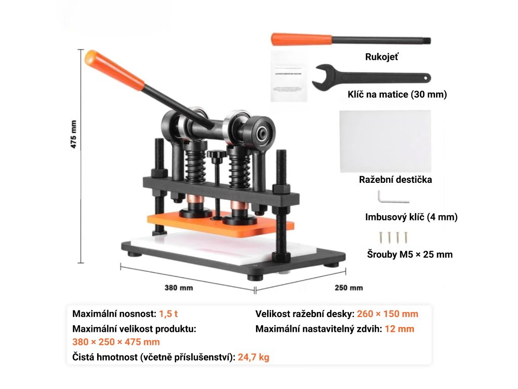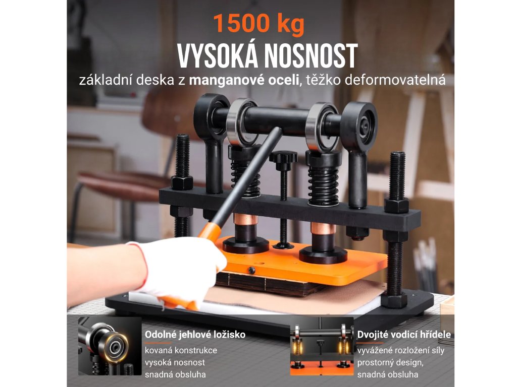 Výsekový lis na kůži s tlakem až 1,5 t a pracovní plochou 260 × 150 mm je určen pro přesné lisování kůže i dalších materiálů. Díky nastavitelnému zdvihu 12 mm, pevné ocelové konstrukci a povrchové úpravě proti korozi nabízí dlouhou životnost a stabilní práci.
