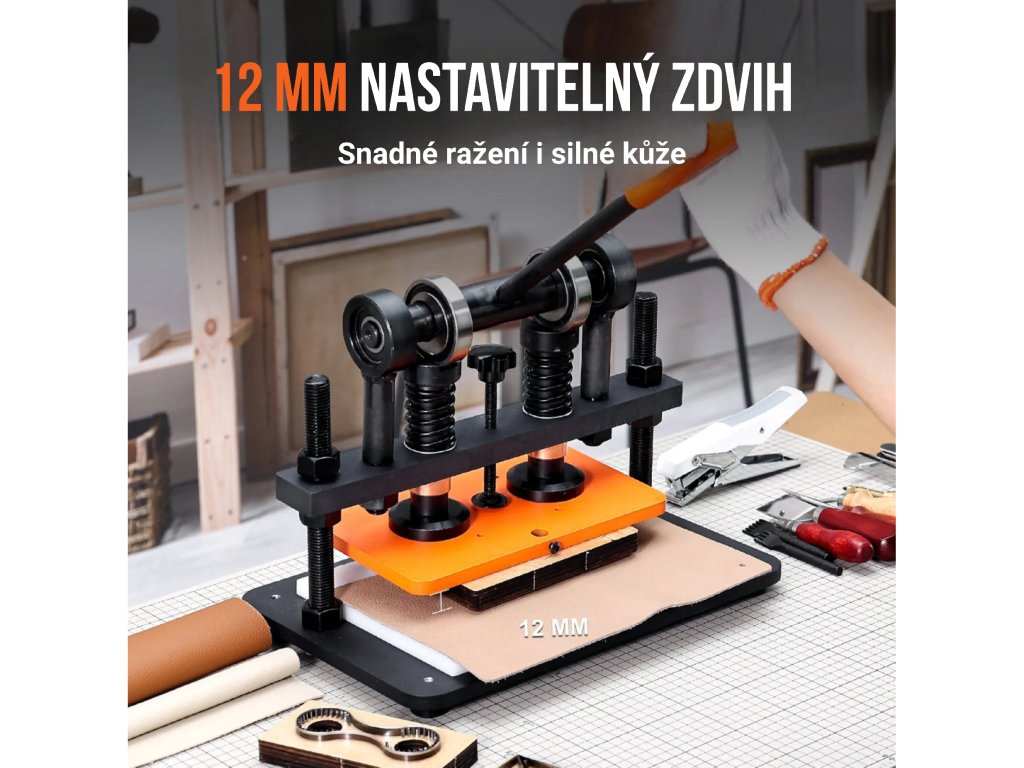 Zařízení nabízí nastavitelný zdvih do 12 mm, což umožňuje přizpůsobení různým tloušťkám kůže a dalších materiálů. Tento parametr rozšiřuje možnosti použití a dává větší volnost při výrobě kožených výrobků a dalších projektů.