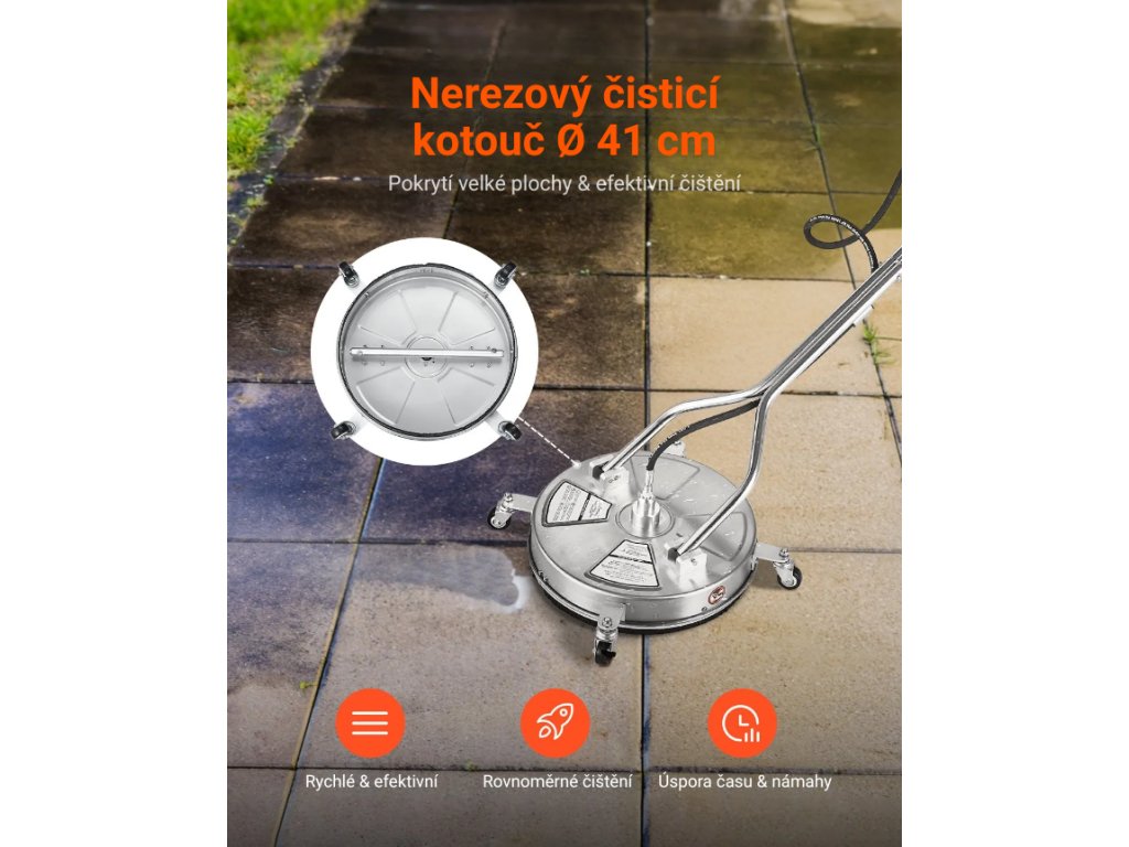 Vysokotlaký čistič povrchů s pracovní šířkou 465 mm, průtokem 15,1 l/min a tlakem až 275 bar je určen pro rychlé a efektivní čištění velkých ploch. Díky dvěma rotujícím tryskám, otočné rukojeti, kolům a kompletnímu příslušenství je jeho použití pohodlné a okamžitě připravené k práci.