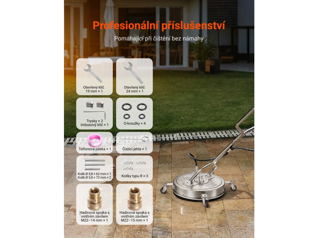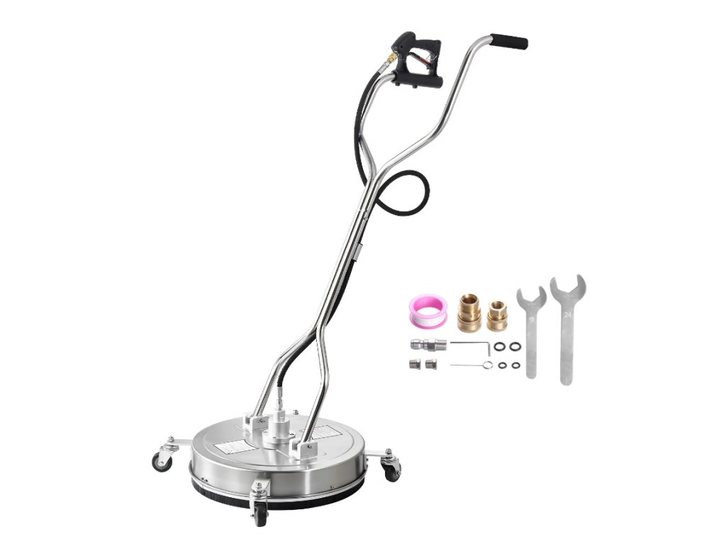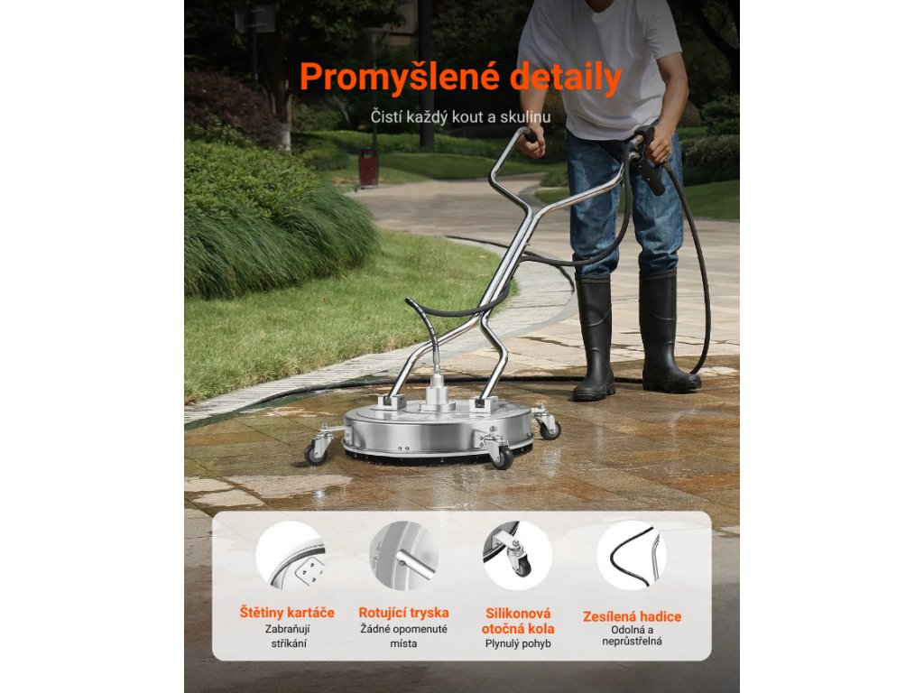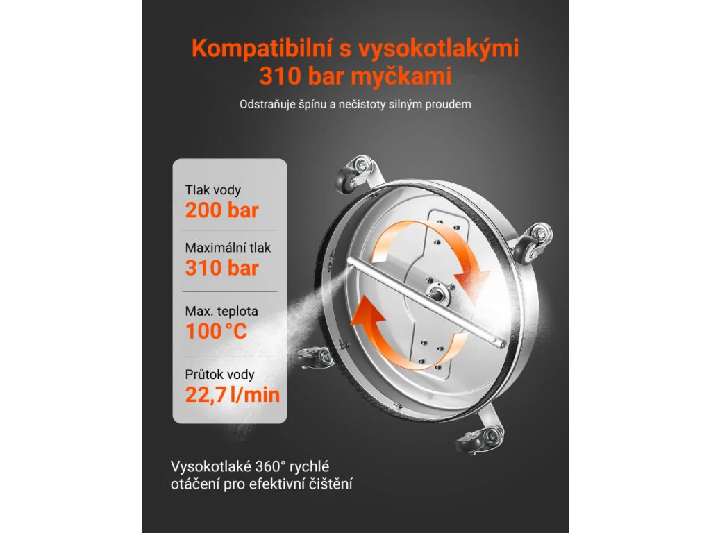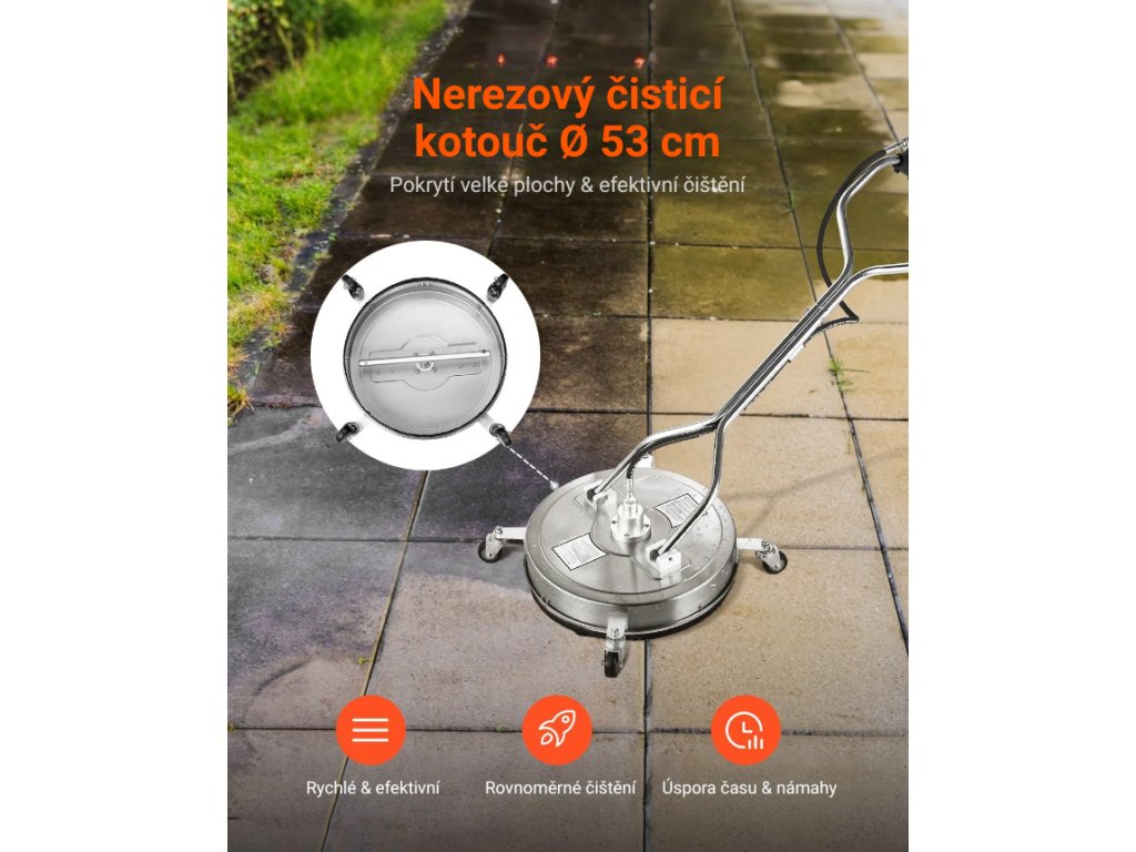 Vysokotlaký čistič povrchů s pracovní šířkou 535 mm, průtokem 22,7 l/min a tlakem až 310 bar je určen pro rychlé a efektivní odstranění nečistot z velkých ploch. Díky dvěma rotujícím tryskám, otočné rukojeti, kolům a kompletnímu příslušenství je jeho použití pohodlné a okamžitě připravené k práci.