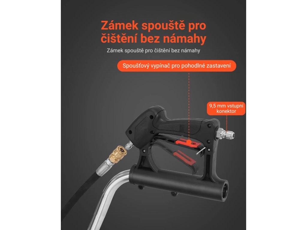 Čistič nabízí jmenovitý tlak 200 bar a maximální tlak 310 bar. Díky dvěma rotujícím tryskám snadno odstraní i odolné nečistoty a skvrny.