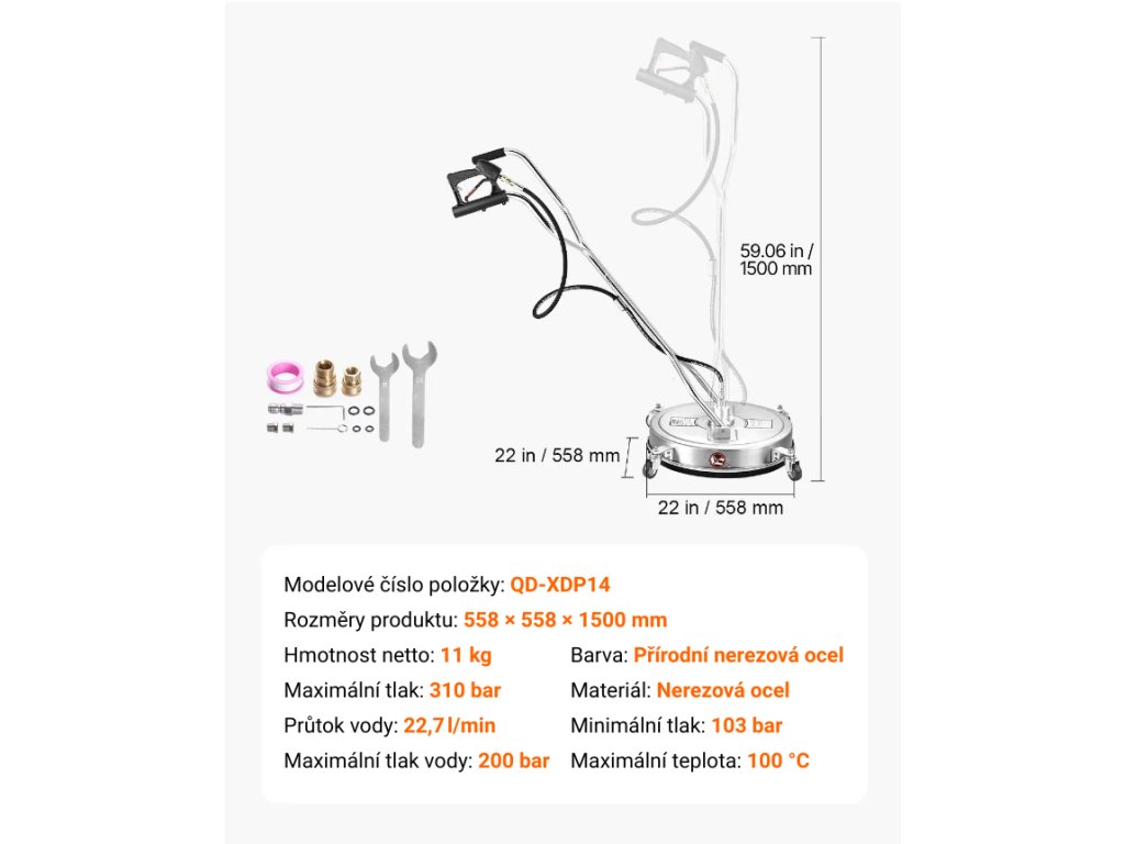 Vysokotlaký čistič s pracovní šířkou 558 mm a průtokem 22,7 l/min nabízí jmenovitý tlak 200 bar a maximální 310 bar, ideální pro rychlé a efektivní odstranění nečistot. Díky rychlospojce 9,5 mm s adaptérem, dvojnásobným rotujícím tryskám a otočné rukojeti je čištění pohodlné a flexibilní, přičemž veškeré profesionální příslušenství umožňuje okamžité použití.