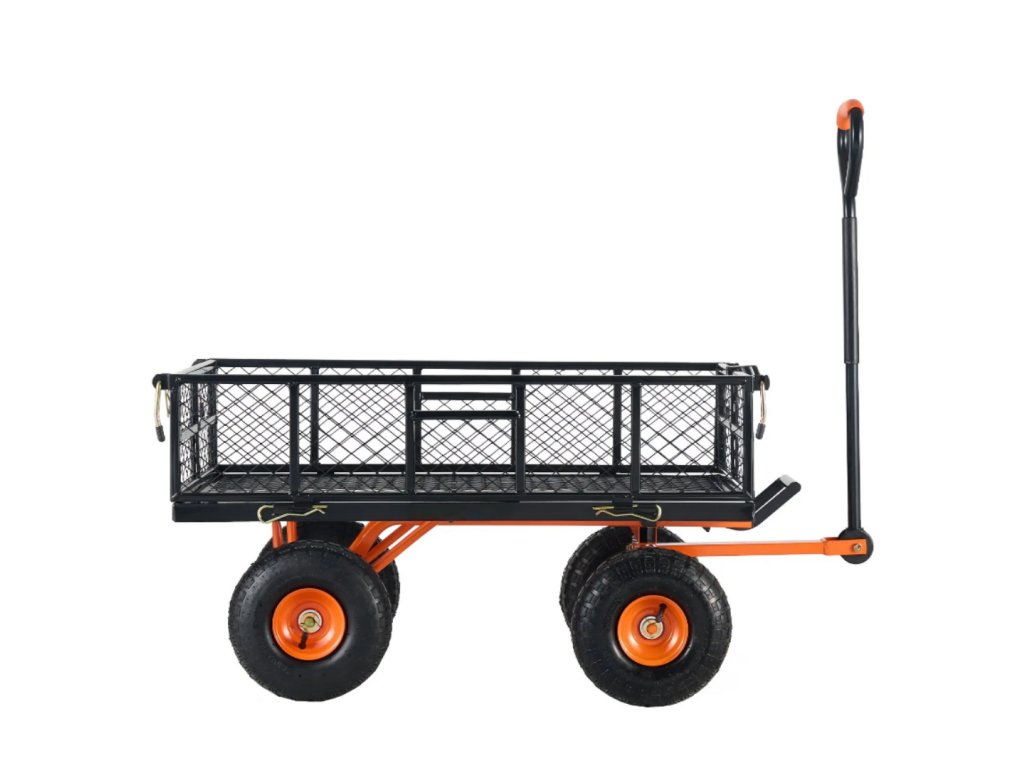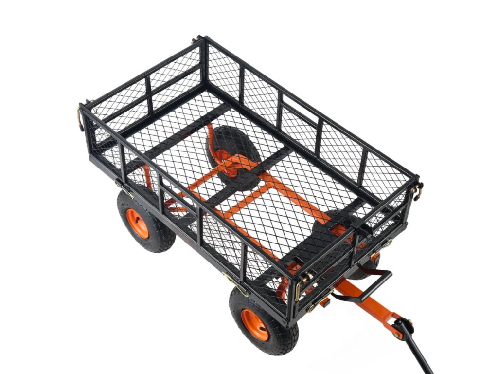 Součástí je síťová ochranná krytka a polstrování, které zajišťují bezpečnost přepravovaného nákladu. Vozík je vhodný pro široké spektrum prostředí, od zahrad, sadů a farem až po sklady, kde efektivně plní různé přepravní úkoly.