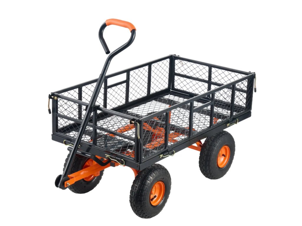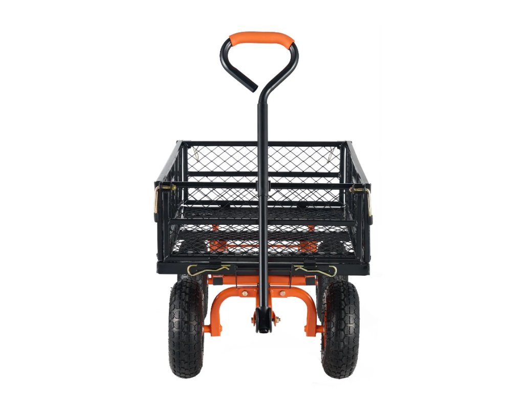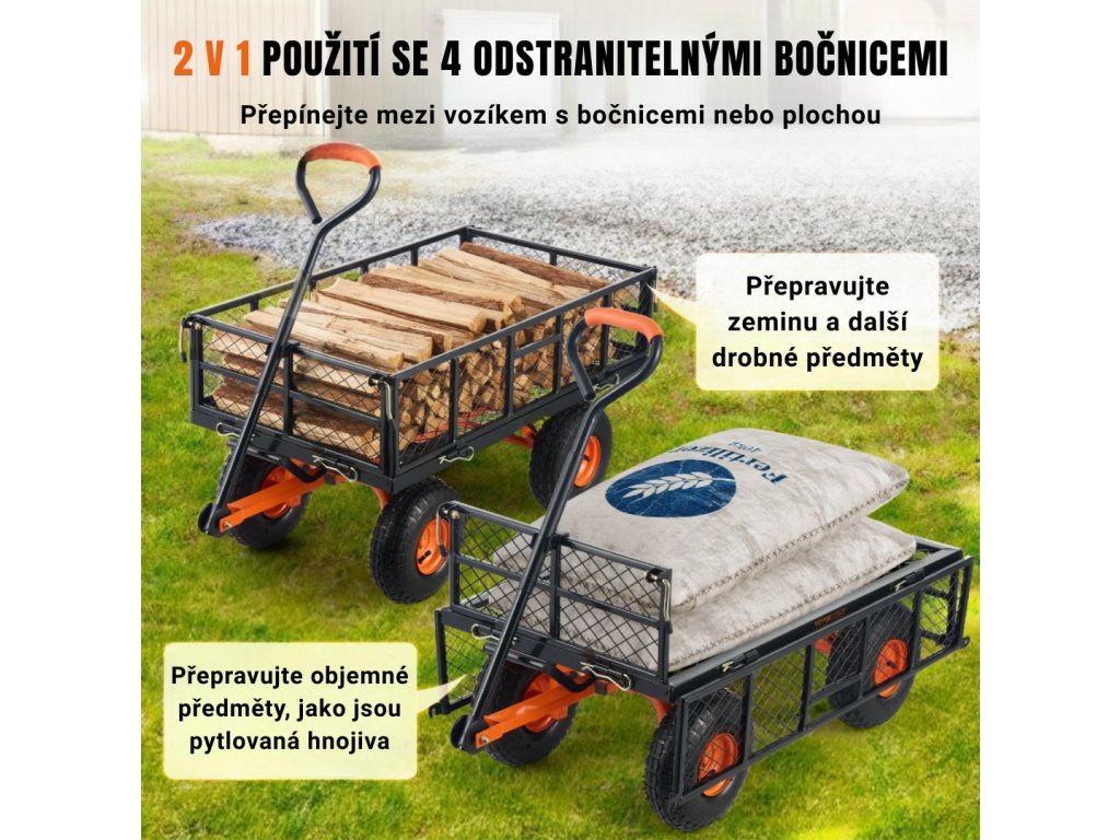 Všechny 4 bočnice jsou odnímatelné, díky čemuž lze vozík přeměnit na přepravní plochu pro velké předměty. Po opětovném nasazení bočnic je možné převážet menší materiály, jako je dřevo nebo zemina, což zajišťuje multifunkční využití.