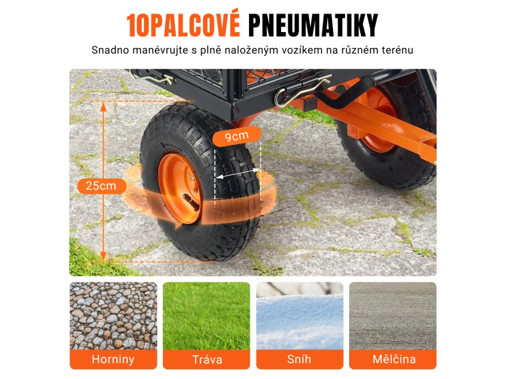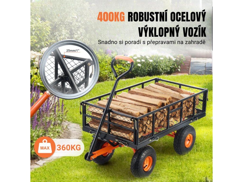 Sklopný vozík s nosností až 400 kg a objemem 0,09 m³ nabízí odnímatelné bočnice pro variabilní využití a kola o průměru 255 mm pro snadnou manipulaci i na nerovném terénu. Díky otočné rukojeti a odnímatelnému spodku umožňuje rychlé a pohodlné vykládání nákladu.