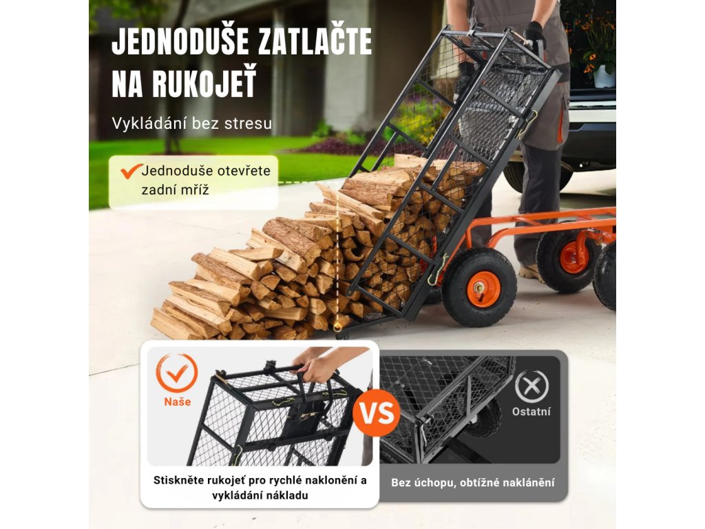 Vozík je vybaven sklopným rámem s předním madlem, které umožňuje rychlé a jednoduché vykládání. Odnímatelná spodní část rámu usnadňuje přeměnu na zahradní korbu. Rukojeť otočná o 180° zjednodušuje manipulaci a zvyšuje produktivitu práce.