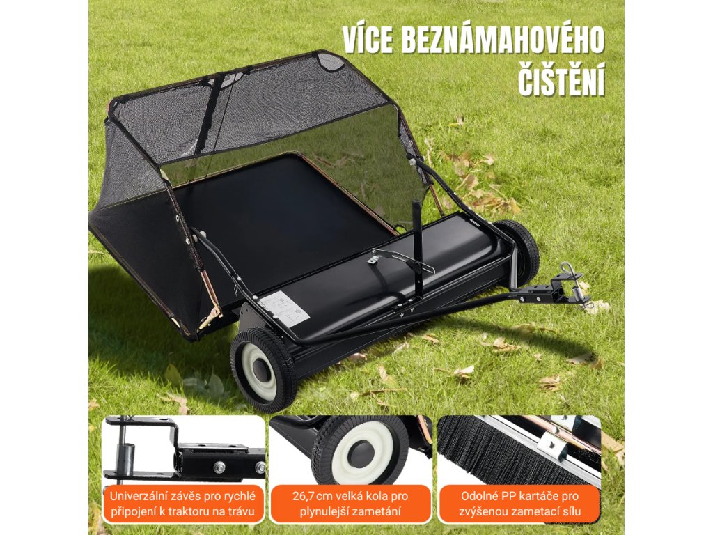 Připojte smeták k zahradnímu traktoru a nechte rotující kartáče rychle sbírat listí, jehličí, malé větvičky a suché nečistoty, což usnadňuje údržbu trávníku.