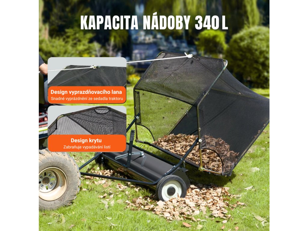 Textilní sběrný vak o objemu 400 l pojme větší množství trávy a listí, aniž by bylo potřeba častého vyprazdňování. Ochranná krytka brání vypadávání materiálu a odvodňovací lanko umožňuje snadné vyprázdnění přímo z traktoru.