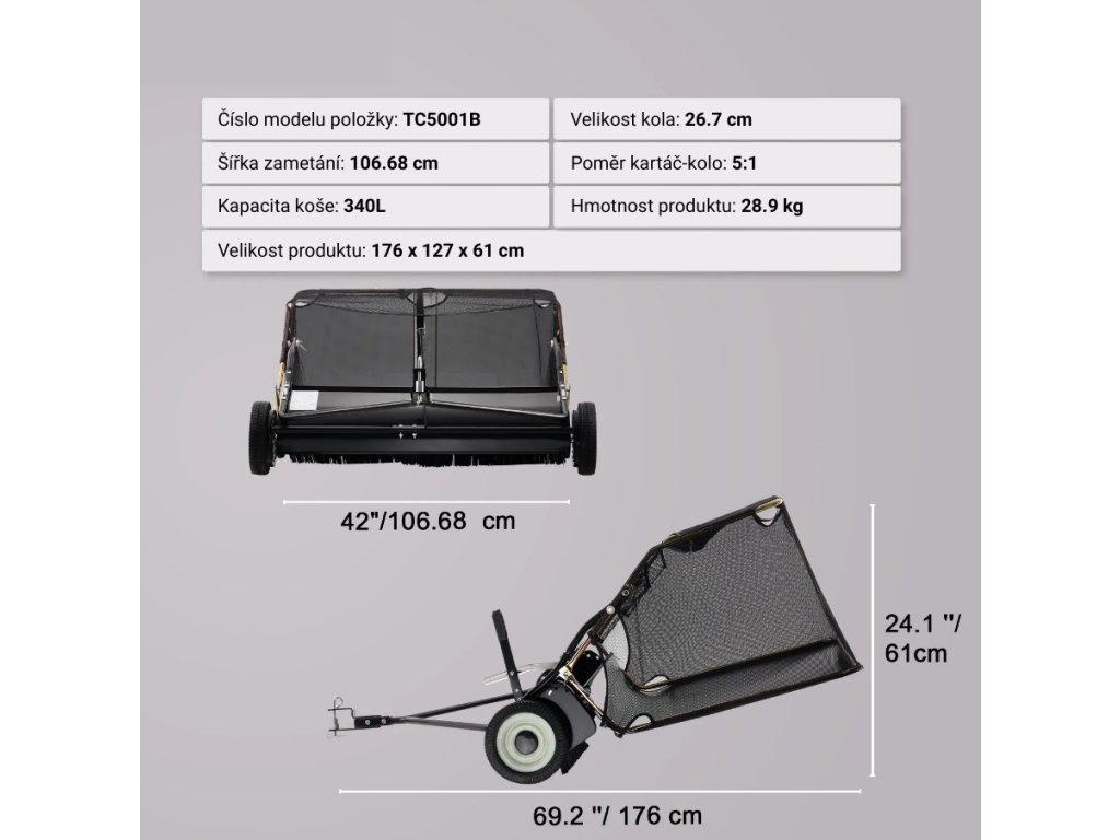 Připojitelný zahradní smeták s nastavitelnou výškou rotujícího kartáče a pracovní šířkou 106,6 cm efektivně sbírá listí, trávu a malé větve. Díky velkokapacitnímu textilnímu sběrnému vaku (400 l) lze zachytit více odpadu najednou a skládací konstrukce umožňuje úsporné uskladnění.