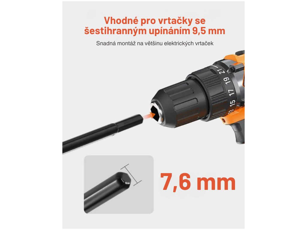 Vrták je vybaven standardní šestihrannou stopkou 9,5 mm, která umožňuje jednoduché uchycení do většiny aku vrtaček. Součástí balení je i adaptér s průměrem uchycení 10 mm pro flexibilní použití s různými typy vrtaček.