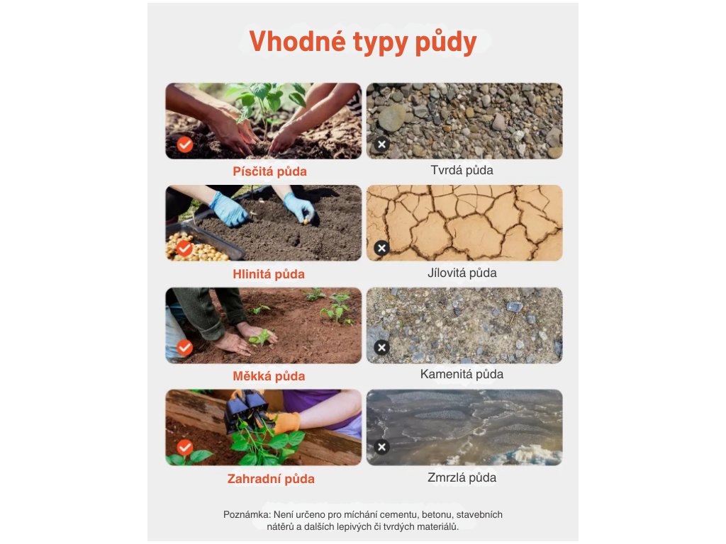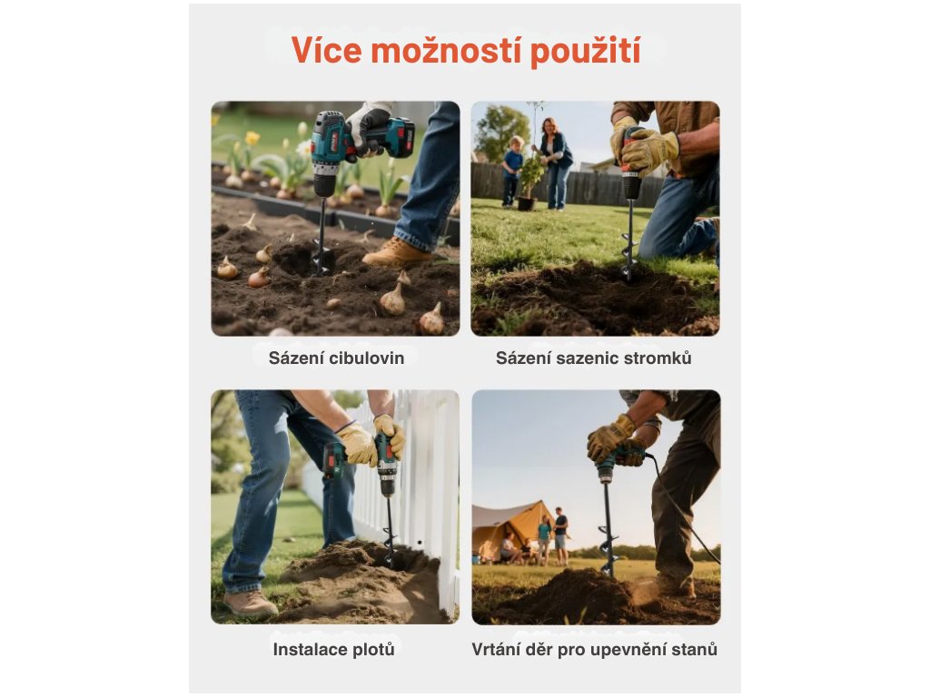 Zemní vrták je ideální pro běžné zahradnické práce jako je sázení květin, cibulovin, bylinek, ale také pro drobné stavební účely – například předvrtání pro kolíky, kůly nebo malé sloupky. Díky malým rozměrům je vhodný pro přesné a opakované vrtání v omezených prostorech.