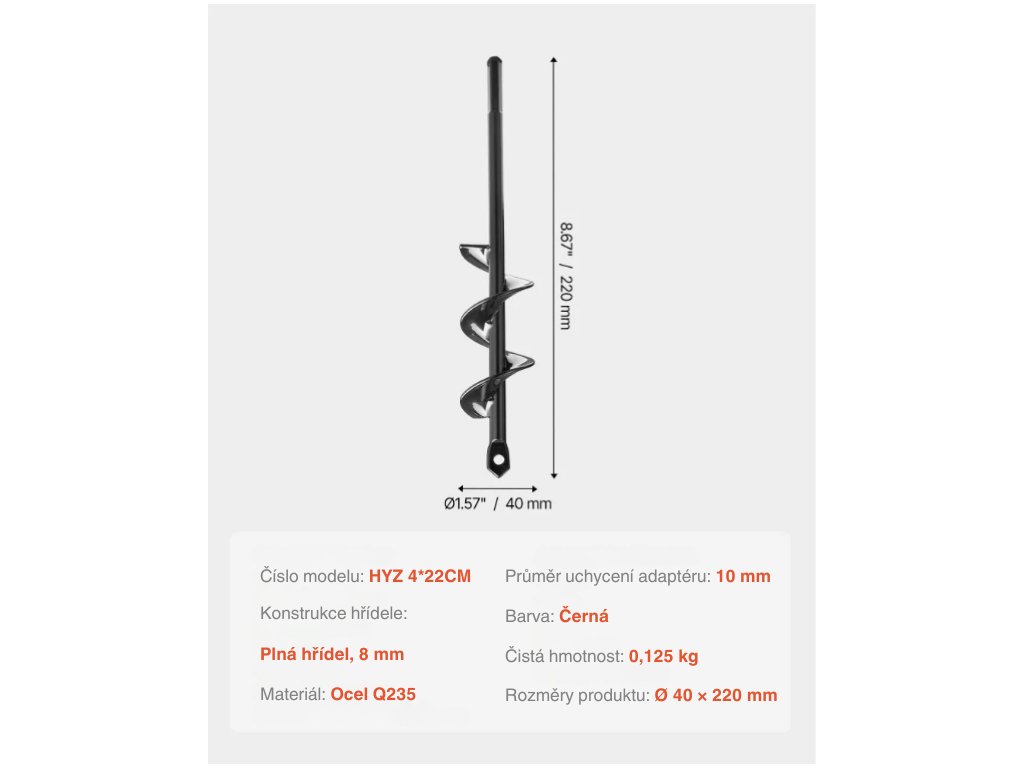 Zemní vrták pro vrtačku, Ø 40 mm, délka 220 mm, adaptér 10 mm